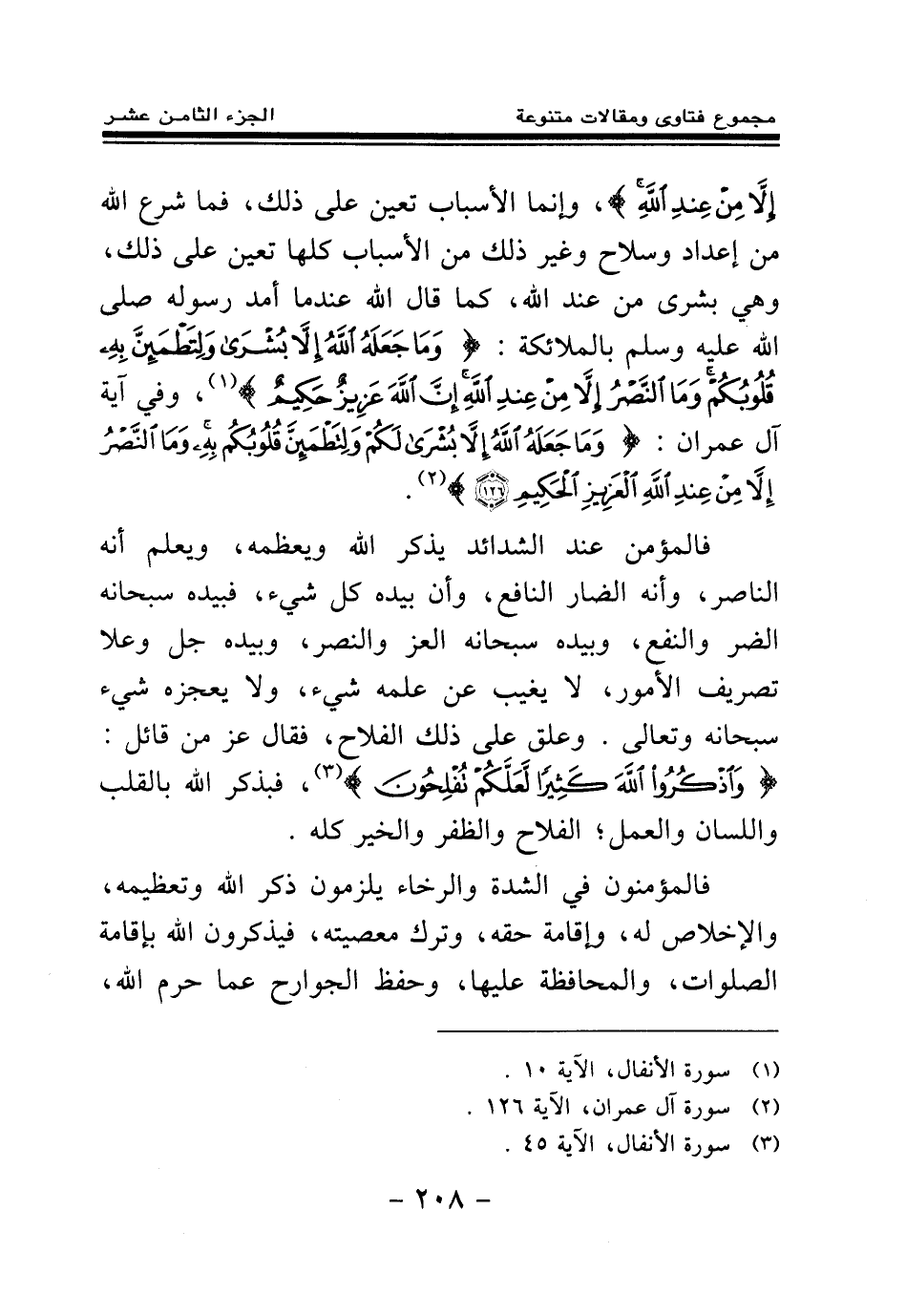 {وَمَا النَّصْرُ إِلَّا مِنْ عِنْدِ اللَّهِ} (¬1) وإنما الأسباب تعين على ذلك، فما شرع الله من إعداد وسلاح وغير ذلك من الأسباب كلها تعين على ذلك، وهي بشرى من عند الله، كما قال الله عندما أمد رسوله صلى الله عليه وسلم بالملائكة: {وَمَا جَعَلَهُ اللَّهُ إِلَّا بُشْرَى وَلِتَطْمَئِنَّ بِهِ قُلُوبُكُمْ وَمَا النَّصْرُ إِلَّا مِنْ عِنْدِ اللَّهِ إِنَّ اللَّهَ عَزِيزٌ حَكِيمٌ} (¬2) وفي آية آل عمران: {وَمَا جَعَلَهُ اللَّهُ إِلَّا بُشْرَى لَكُمْ وَلِتَطْمَئِنَّ قُلُوبُكُمْ بِهِ وَمَا النَّصْرُ إِلَّا مِنْ عِنْدِ اللَّهِ الْعَزِيزِ الْحَكِيمِ} (¬3)