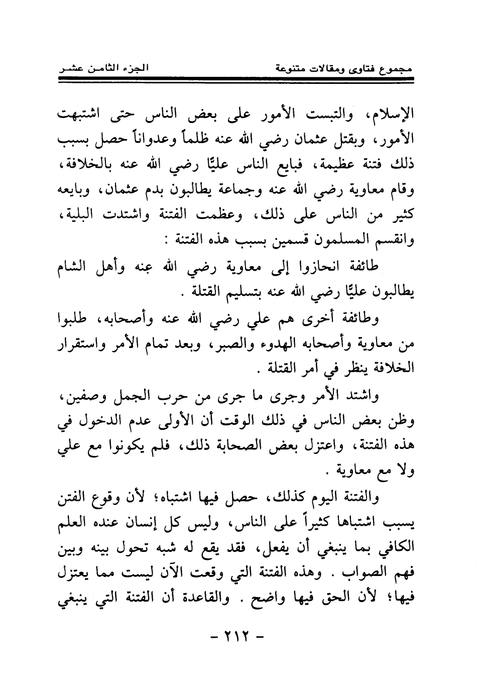 الإسلام، والتبست الأمور على بعض الناس حتى اشتبهت الأمور، وبقتل عثمان رضي الله عنه ظلما وعدوانا حصل بسبب ذلك فتنة عظيمة، فبايع الناس عليا رضي الله عنه بالخلافة، وقام معاوية رضي الله عنه وجماعة يطالبون بدم عثمان، وبايعه كثير من الناس على ذلك، وعظمت الفتنة واشتدت البلية، وانقسم المسلمون قسمين بسبب هذه الفتنة: