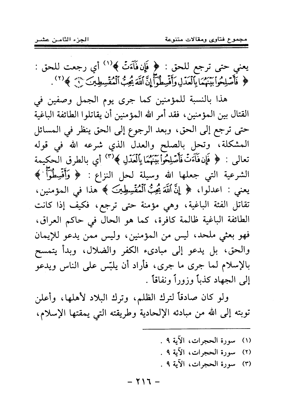 هذا بالنسبة للمؤمنين، كما جرى يوم الجمل وصفين في القتال بين المؤمنين، فقد أمر الله المؤمنين أن يقاتلوا الطائفة الباغية حتى ترجع إلى الحق، وبعد الرجوع إلى الحق ينظر في المسائل المشكلة، وتحل بالصلح والعدل الذي شرعه الله في قوله تعالى: {فَإِنْ فَاءَتْ فَأَصْلِحُوا بَيْنَهُمَا بِالْعَدْلِ وَأَقْسِطُوا} (¬3) أي بالطرق الحكيمة الشرعية التي جعلها الله وسيلة لحل النزاع {وَأَقْسِطُوا} (¬4) يعني: اعدلوا {إِنَّ اللَّهَ يُحِبُّ الْمُقْسِطِينَ} (¬5) هذا في المؤمنين، تقاتل الفئة الباغية، وهي مؤمنة حتى ترجع، فكيف إذا كانت الطائفة الباغية ظالمة كافرة، كما هو الحال في حاكم العراق، فهو بعثي ملحد، ليس من المؤمنين، وليس ممن يدعو للإيمان والحق، بل يدعو إلى مبادئ الكفر والضلال، وبدأ يتمسح بالإسلام لما جرى ما جرى، فأراد أن يلبس على الناس ويدعو إلى الجهاد كذبا وزورا ونفاقا.
