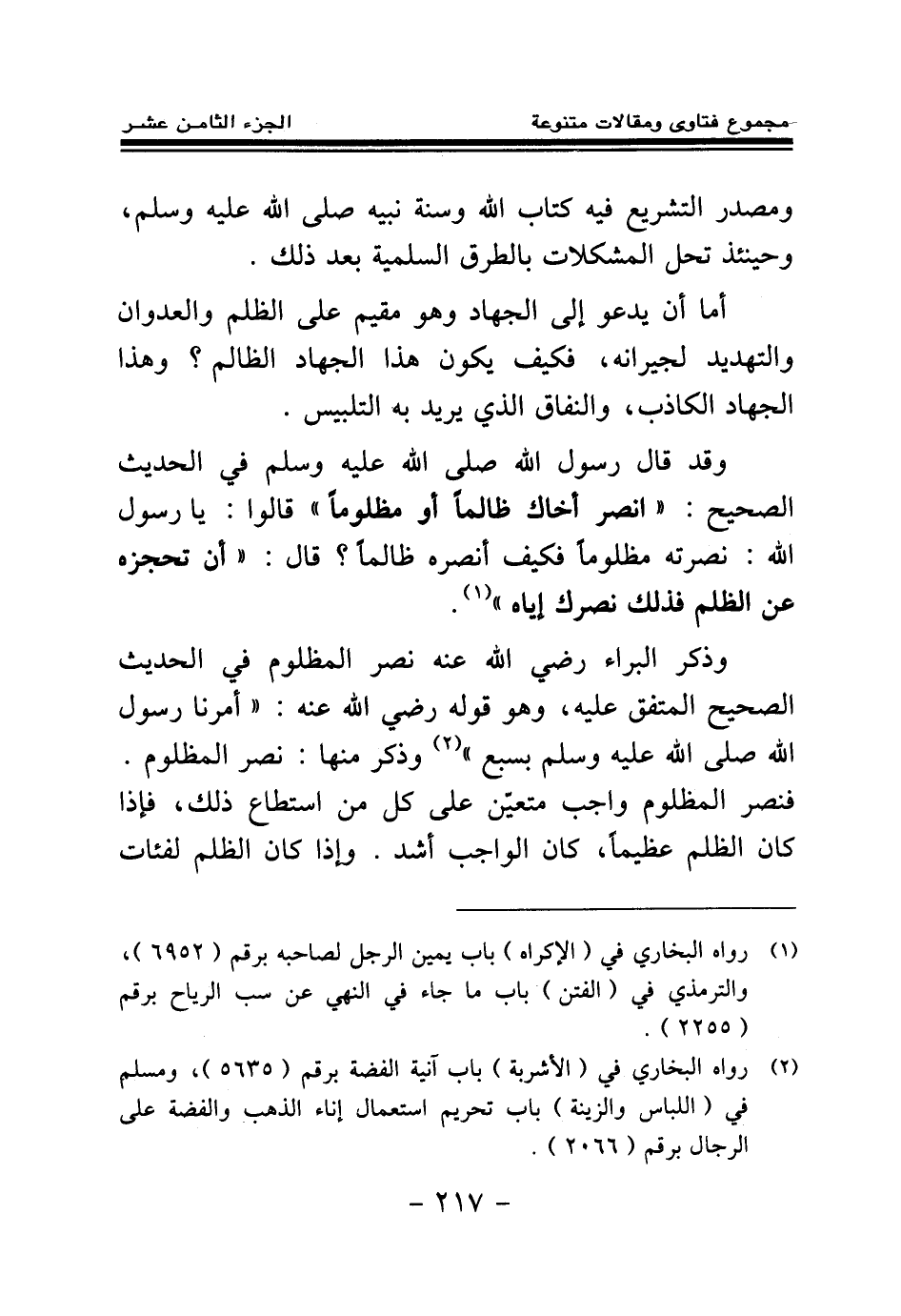 وذكر البراء رضي الله عنه نصر المظلوم في الحديث الصحيح المتفق عليه، وهو قوله رضي الله عنه: «أمرنا رسول الله- صلى الله عليه وسلم- بسبع وذكر منها: نصر المظلوم (¬2) » ، فنصر المظلوم واجب متعين على كل من استطاع ذلك فإذا كان الظلم عظيما، كان الواجب أشد. وإذا كان الظلم لفئات