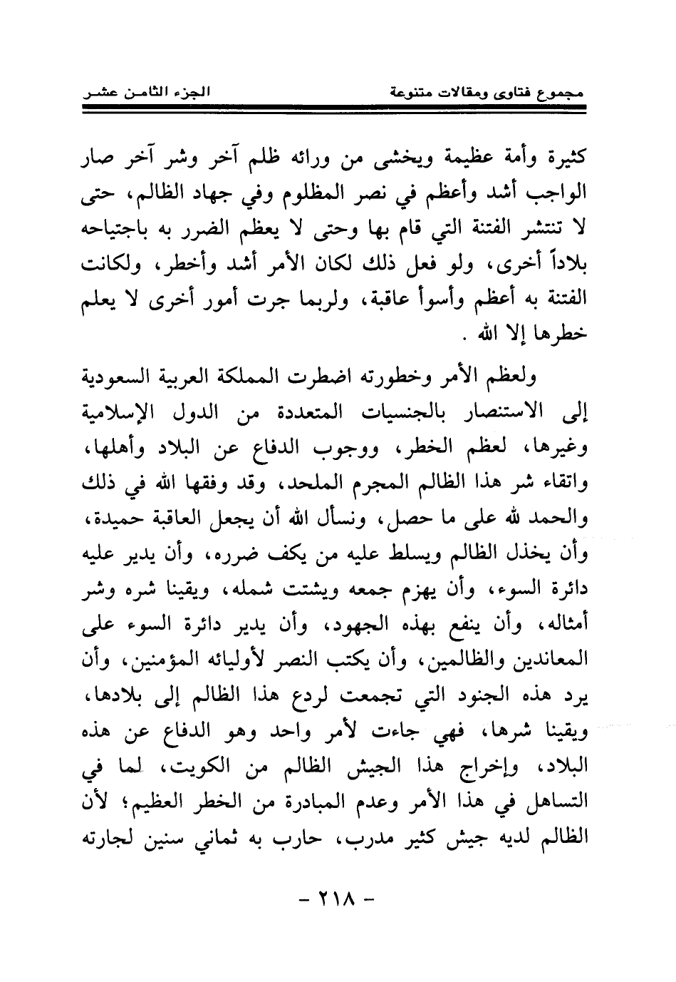 ولعظم الأمر وخطورته اضطرت المملكة العربية السعودية إلى الاستنصار بالجنسيات المتعددة من الدول الإسلامية وغيرها، لعظم الخطر، ووجوب الدفاع عن البلاد وأهلها، واتقاء شر هذا الظالم المجرم الملحد، وقد وفقها الله في ذلك والحمد لله على ما حصل، ونسأل الله أن يجعل العاقبة حميدة، وأن يخذل الظالم ويسلط عليه من يكف ضرره، وأن يدير عليه دائرة السوء، وأن يهزم جمعه ويشتت شمله، ويقينا شره وشر أمثاله، وأن ينفع بهذه الجهود، وأن يدير دائرة السوء على المعاندين والظالمين، وأن يكتب النصر لأوليائه المؤمنين، وأن يرد هذه الجنود التي تجمعت لردع هذا الظالم إلى بلادها، ويقينا شرها، فهي جاءت لأمر واحد وهو الدفاع عن هذه البلاد، وإخراج هذا الجيش الظالم من الكويت، لما في التساهل في هذا الأمر وعدم المبادرة من الخطر العظيم؛ لأن الظالم لديه جيش كثير مدرب، حارب به ثمان سنين لجارته