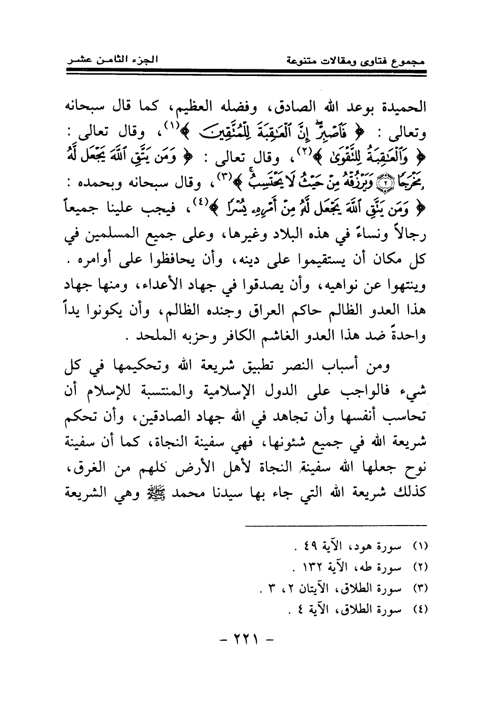 الحميدة بوعد الله الصادق، وفضله العظيم، كما قال سبحانه وتعالى: {فَاصْبِرْ إِنَّ الْعَاقِبَةَ لِلْمُتَّقِينَ} (¬1) وقال تعالى: {وَالْعَاقِبَةُ لِلتَّقْوَى} (¬2) وقال تعالى: {وَمَنْ يَتَّقِ اللَّهَ يَجْعَلْ لَهُ مَخْرَجًا} (¬3) {وَيَرْزُقْهُ مِنْ حَيْثُ لَا يَحْتَسِبُ} (¬4) وقال سبحانه وبحمده: {وَمَنْ يَتَّقِ اللَّهَ يَجْعَلْ لَهُ مِنْ أَمْرِهِ يُسْرًا} (¬5) فيجب علينا جميعا رجالا ونساء في هذه البلاد وغيرها، وعلى جميع المسلمين في كل مكان أن يستقيموا على دينه، وأن يحافظوا على أوامره وينتهوا عن نواهيه، وأن يصدقوا في جهاد الأعداء، ومنها جهاد هذا العدو الظالم حاكم العراق وجنده الظالم، وأن يكونوا يدا واحدة ضد هذا العدو الغاشم الكافر وحزبه الملحد.