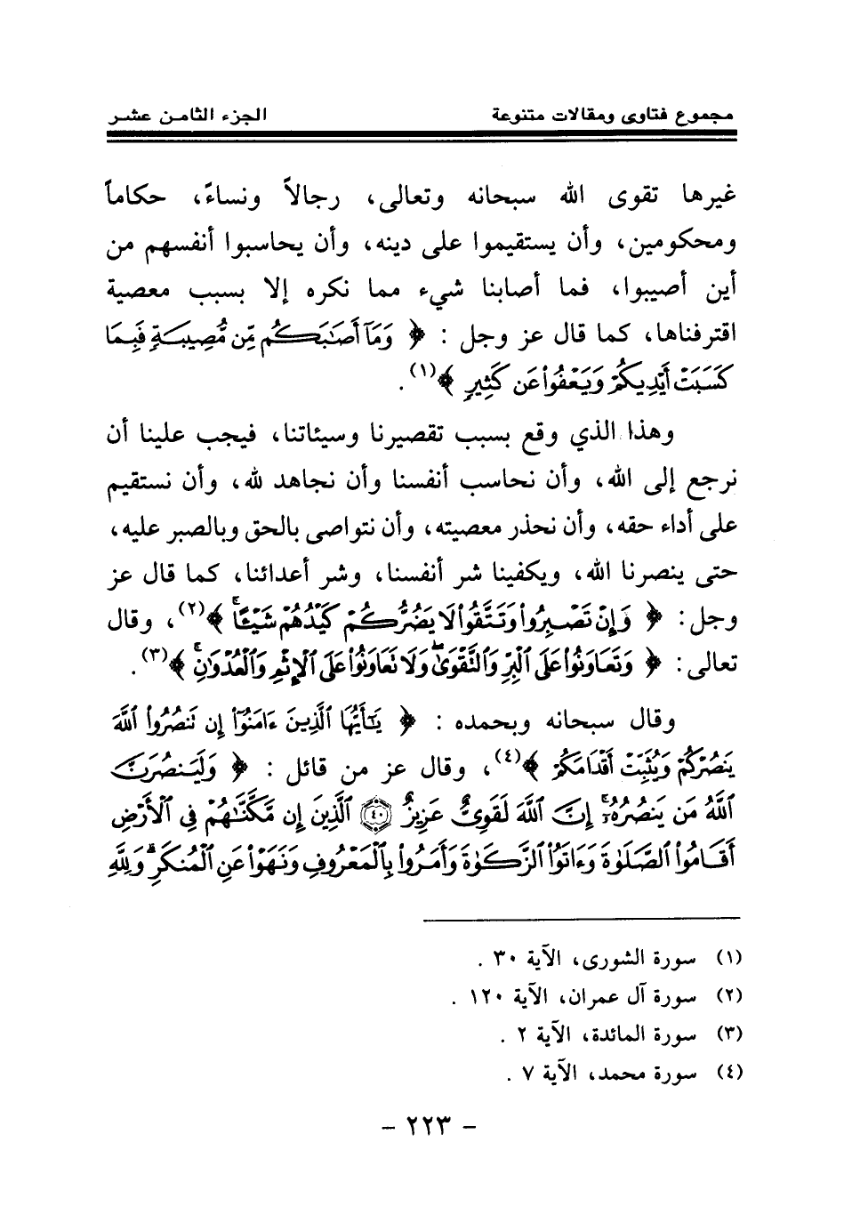 وهذا الذي وقع بسبب تقصيرنا وسيئاتنا، فيجب علينا أن نرجع إلى الله، وأن نحاسب أنفسنا، وأن نجاهد لله، وأن نستقيم على حقه، وأن نحذر معصيته، وأن نتواصى بالحق وبالصبر عليه، حتى ينصرنا الله، ويكفينا شر أنفسنا، وشر أعدائنا، كما قال عز وجل: {وَإِنْ تَصْبِرُوا وَتَتَّقُوا لَا يَضُرُّكُمْ كَيْدُهُمْ شَيْئًا} (¬2) وقال تعالى: {وَتَعَاوَنُوا عَلَى الْبِرِّ وَالتَّقْوَى وَلَا تَعَاوَنُوا عَلَى الْإِثْمِ وَالْعُدْوَانِ} (¬3)