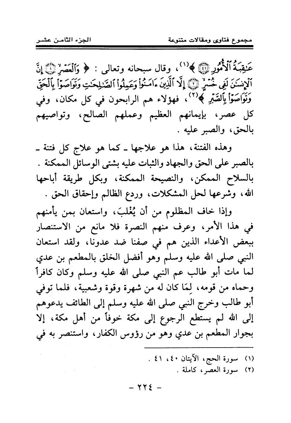 وقال سبحانه وتعالى: {وَالْعَصْرِ} (¬1) {إِنَّ الْإِنْسَانَ لَفِي خُسْرٍ} (¬2) {إِلَّا الَّذِينَ آمَنُوا وَعَمِلُوا الصَّالِحَاتِ وَتَوَاصَوْا بِالْحَقِّ وَتَوَاصَوْا بِالصَّبْرِ} (¬3) فهؤلاء هم الرابحون في كل مكان، وفي كل عصر، بإيمانهم العظيم وعملهم الصالح، وتواصيهم بالحق، والصبر عليه.