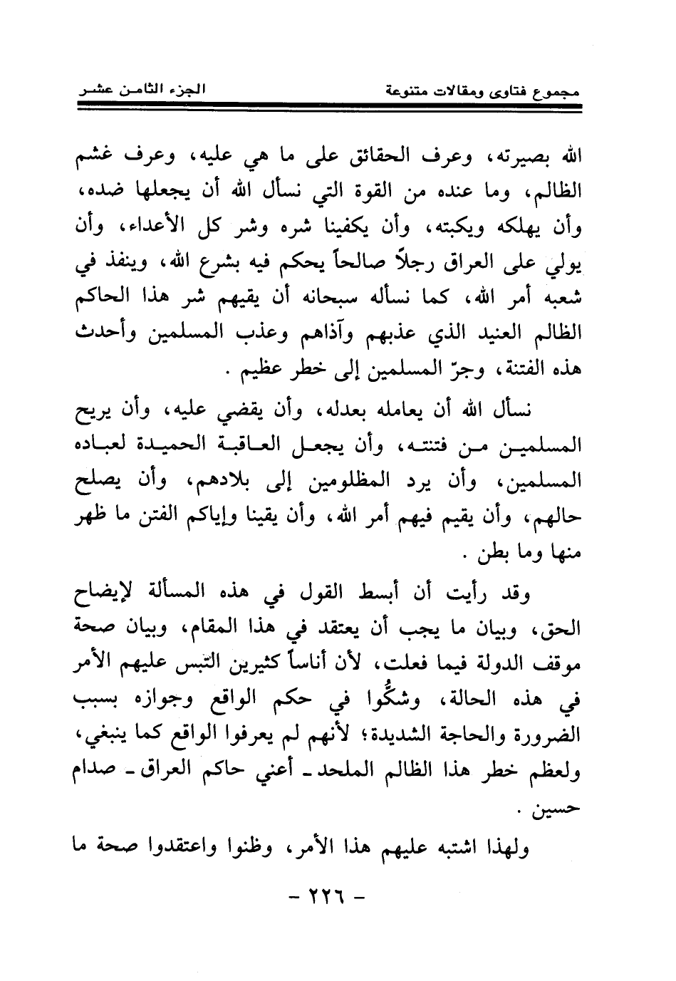 الله بصيرته، وعرف الحقائق على ما هي عليه، وعرف غشم الظالم، وما عنده من القوة التي نسأل الله أن يجعلها ضده، وأن يهلكه ويكبته، وأن يكفينا شره وشر كل الأعداء، وأن يولي على العراق رجلا صالحا يحكم فيه بشرع الله، وينفذ في شعبه أمر الله، كما نسأله سبحانه أن يقيهم شر هذا الحاكم الظالم العنيد الذي عذبهم وآذاهم وعذب المسلمين وأحدث هذه الفتنة، وجر المسلمين إلى خطر عظيم.