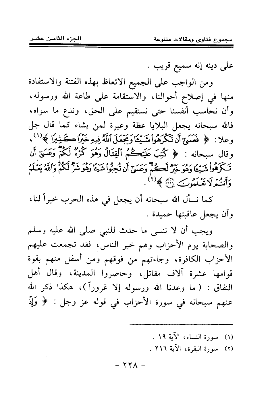ومن الواجب على الجميع الاتعاظ بهذه الفتن والاستفادة منها في إصلاح أحوالنا، والاستقامة على طاعة الله ورسوله، وأن نحاسب أنفسنا حتى نستقيم على الحق، وندع ما سواه، فالله سبحانه يجعل البلايا عظة وعبرة لمن يشاء، كما قال جل وعلا: {فَعَسَى أَنْ تَكْرَهُوا شَيْئًا وَيَجْعَلَ اللَّهُ فِيهِ خَيْرًا كَثِيرًا} (¬1) وقال سبحانه: {كُتِبَ عَلَيْكُمُ الْقِتَالُ وَهُوَ كُرْهٌ لَكُمْ وَعَسَى أَنْ تَكْرَهُوا شَيْئًا وَهُوَ خَيْرٌ لَكُمْ وَعَسَى أَنْ تُحِبُّوا شَيْئًا وَهُوَ شَرٌّ لَكُمْ وَاللَّهُ يَعْلَمُ وَأَنْتُمْ لَا تَعْلَمُونَ} (¬2)
