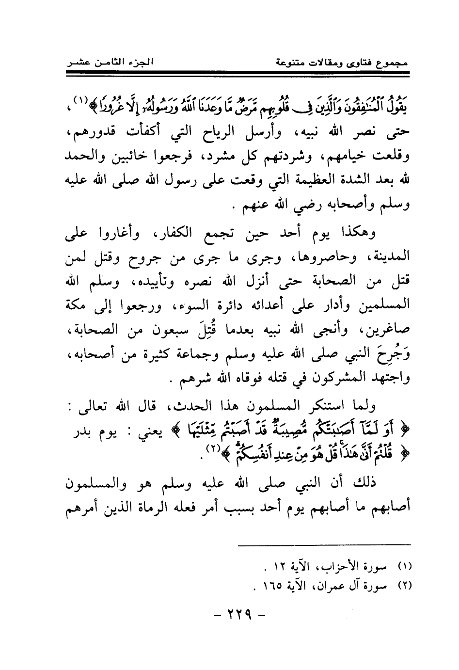 {وَإِذْ يَقُولُ الْمُنَافِقُونَ وَالَّذِينَ فِي قُلُوبِهِمْ مَرَضٌ مَا وَعَدَنَا اللَّهُ وَرَسُولُهُ إِلَّا غُرُورًا} (¬1) حتى نصر الله نبيه، وأرسل الرياح التي أكفأت قدورهم، وقلعت خيامهم، وشردتهم كل مشرد، فرجعوا خائبين، والحمد لله بعد الشدة العظيمة التي وقعت على رسول الله - صلى الله عليه وسلم - وأصحابه - رضي الله عنهم -.