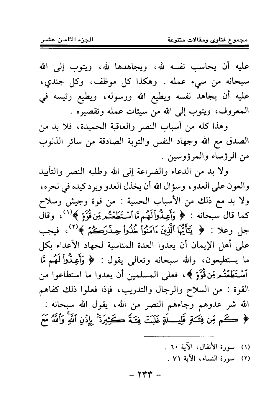 وهذا كله من أسباب النصر والعاقبة الحميدة، فلا بد من الصدق مع الله وجهاد النفس والتوبة الصادقة من سائر الذنوب من الرؤساء والمرءوسين.