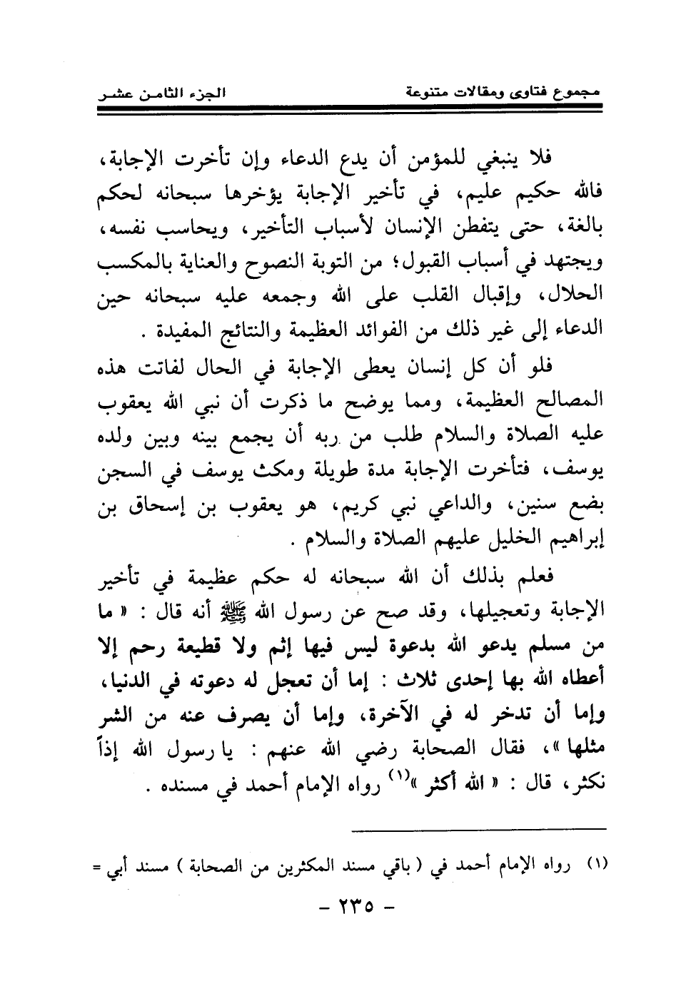 فعلم بذلك أن الله سبحانه له حكم عظيمة في تأخير الإجابة وتعجيلها. وقد صح عن رسول الله - صلى الله عليه وسلم - أنه قال: «ما من مسلم يدعو الله بدعوة ليس فيها إثم ولا قطيعة رحم إلا أعطاه الله بها إحدى ثلاث إما أن تعجل له دعوته في الدنيا وإما أن تدخر له في الآخرة وإما أن يصرف عنه من الشر مثلها، فقال الصحابة رضي الله عنهم: يا رسول الله إذا نكثر، قال: الله أكثر (¬1) » (¬2) . رواه الإمام أحمد في مسنده.