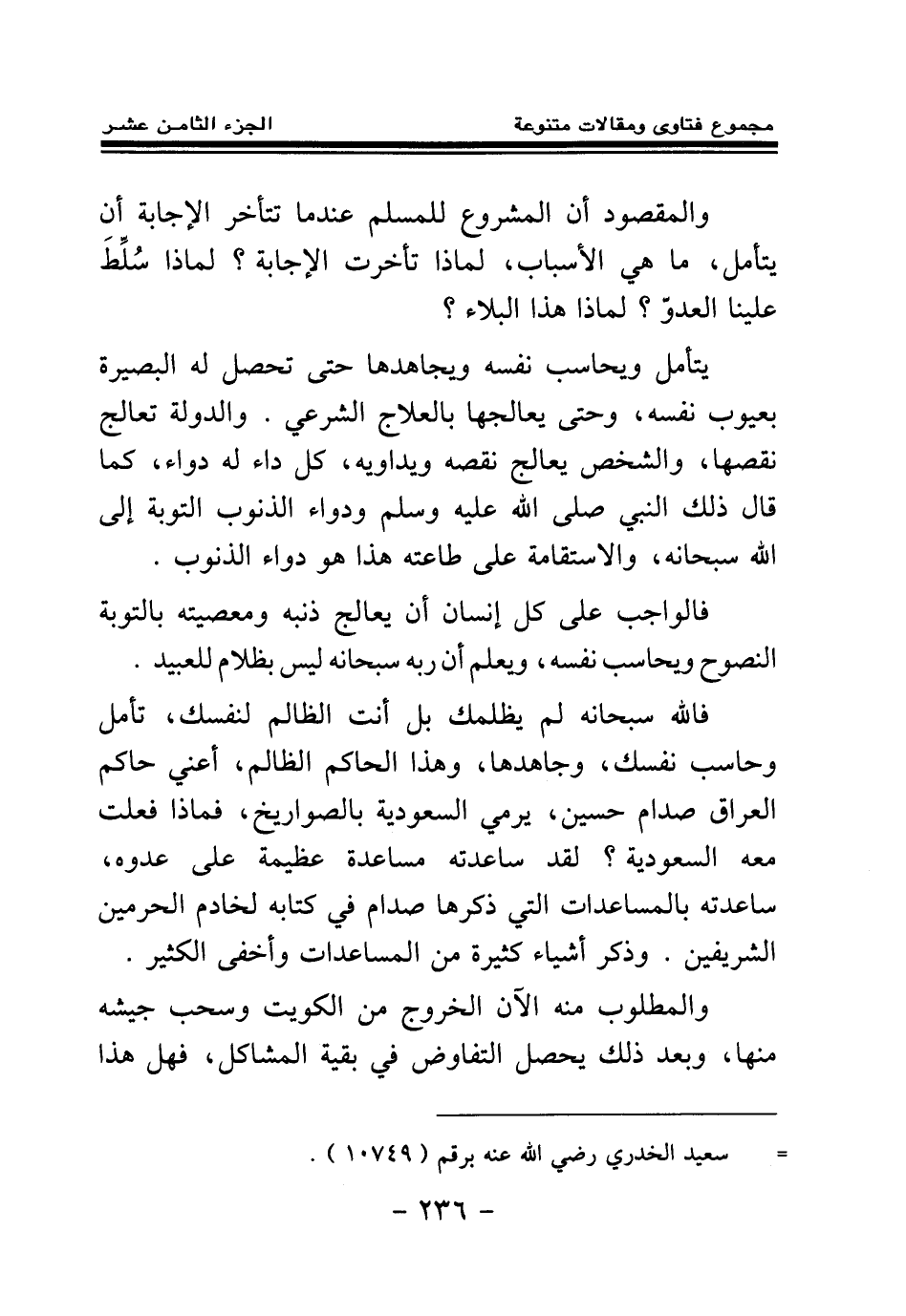 فالله سبحانه لم يظلمك بل أنت الظالم لنفسك، تأمل وحاسب نفسك، وجاهدها، وهذا الحاكم الظالم، أعني حاكم العراق صدام حسين يرمي السعودية بالصواريخ، فماذا فعلت معه السعودية؟ لقد ساعدته مساعدة عظيمة على عدوه، ساعدته بالمساعدات التي ذكرها صدام في كتابه لخادم الحرمين الشريفين. وذكر أشياء كثيرة من المساعدات وأخفى الكثير.