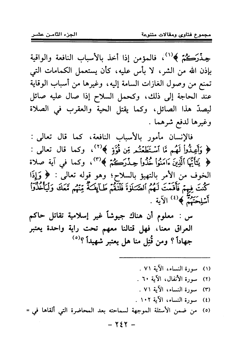{يَا أَيُّهَا الَّذِينَ آمَنُوا خُذُوا حِذْرَكُمْ} (¬1) فالمؤمن إذا أخذ بالأسباب النافعة والواقية بإذن الله من الشر، لا بأس عليه، كأن يستعمل الكمامات التي تمنع من وصول الغازات السامة إليه، وغيرها من أسباب الوقاية عند الحاجة إلى ذلك، وكحمل السلاح إذا صال عليه صائل ليصد هذا الصائل، وكما يقتل الحية والعقرب في الصلاة وغيرها لدفع شرهما.