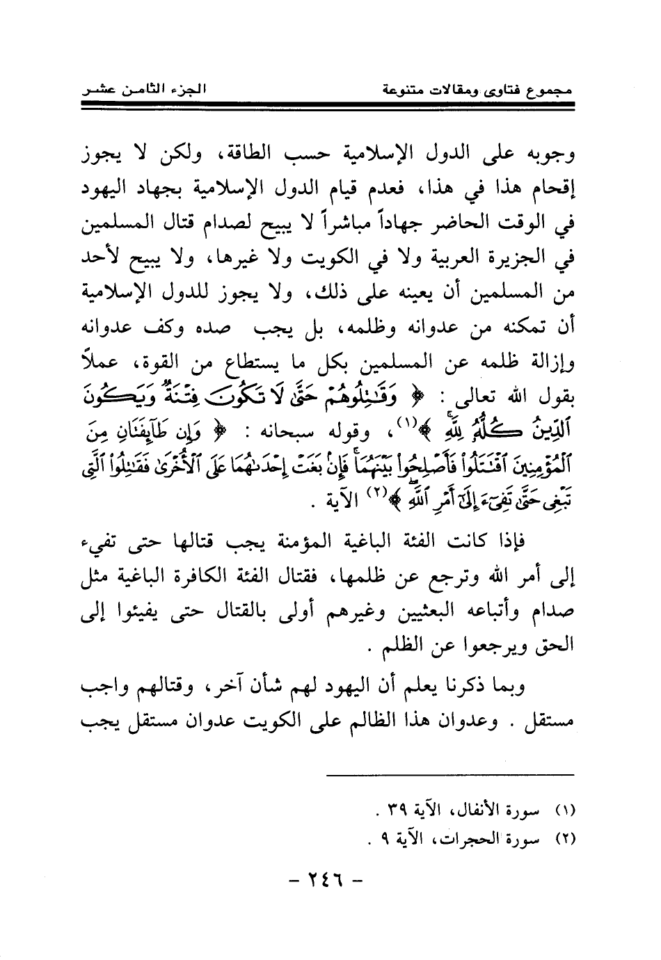 وجوبه على الدول الإسلامية حسب الطاقة، ولكن لا يجوز إقحام هذا في هذا، فعدم قيام الدول الإسلامية بجهاد اليهود في الوقت الحاضر جهادا مباشرا لا يبيح لصدام قتال المسلمين في الجزيرة العربية ولا في الكويت ولا غيرها، ولا يبيح لأحد من المسلمين أن يعينه على ذلك، ولا يجوز للدول الإسلامية أن تمكنه من عدوانه وظلمه، بل يجب صده وكف عدوانه وإزالة ظلمه عن المسلمين بكل ما يستطاع من القوة عملا بقول الله تعالى: {وَقَاتِلُوهُمْ حَتَّى لَا تَكُونَ فِتْنَةٌ وَيَكُونَ الدِّينُ كُلُّهُ لِلَّهِ} (¬1) وقوله سبحانه: {وَإِنْ طَائِفَتَانِ مِنَ الْمُؤْمِنِينَ اقْتَتَلُوا فَأَصْلِحُوا بَيْنَهُمَا فَإِنْ بَغَتْ إِحْدَاهُمَا عَلَى الْأُخْرَى فَقَاتِلُوا الَّتِي تَبْغِي حَتَّى تَفِيءَ إِلَى أَمْرِ اللَّهِ} (¬2) الآية.