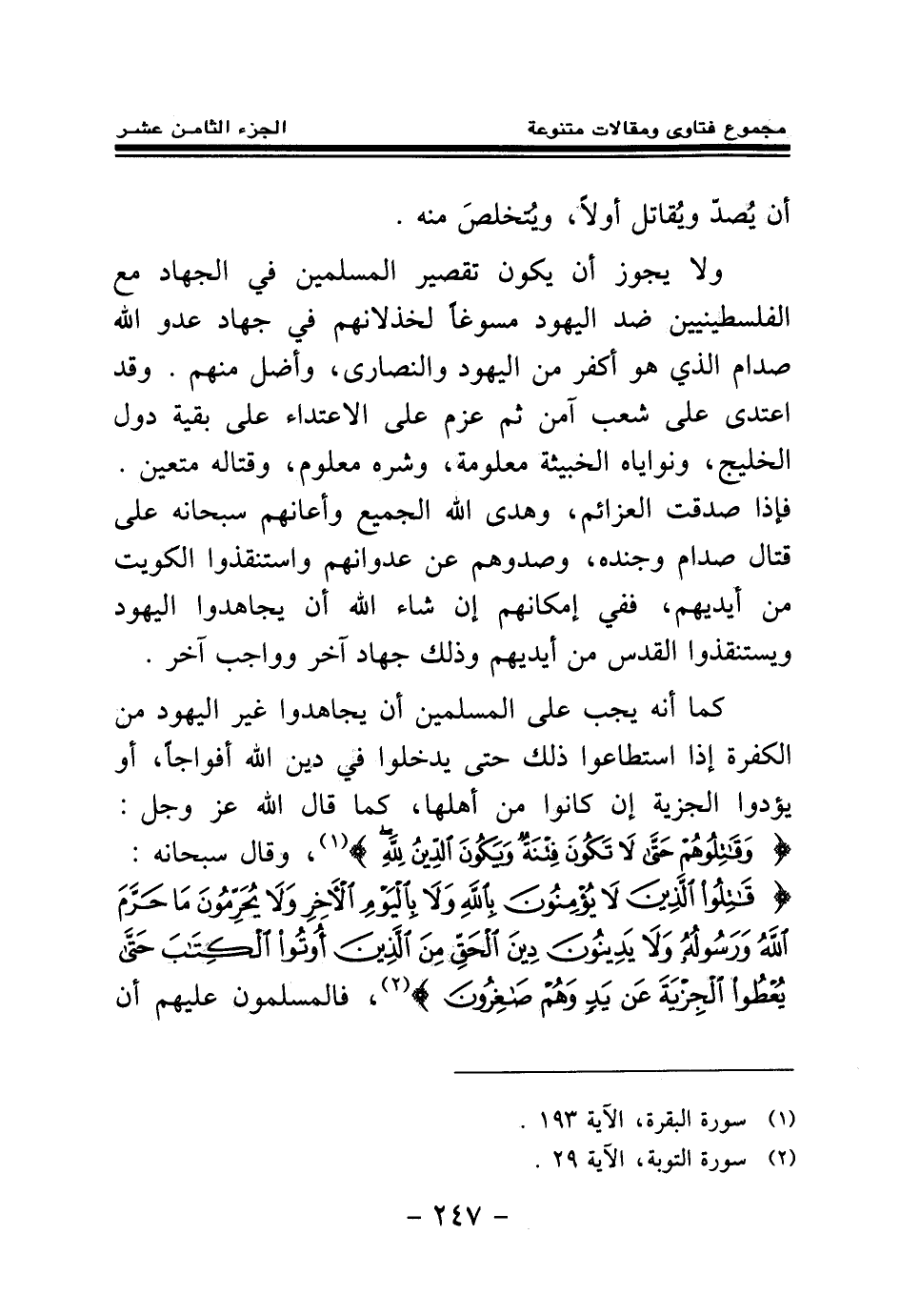 ولا يجوز أن يكون تقصير المسلمين في الجهاد مع الفلسطينيين ضد اليهود مسوغا لخذلانهم في جهاد عدو الله صدام الذي هو أكفر من اليهود والنصارى، وأضل منهم. وقد اعتدى على شعب آمن ثم عزم على الاعتداء على بقية دول الخليج، ونواياه الخبيثة معلومة، وشر معلوم، وقتاله متعين. فإذا صدقت العزائم، وهدى الله الجميع وأعانهم سبحانه على قتال صدام وجنده، وصدوهم عن عدوانهم واستنقذوا الكويت من أيديهم، ففي إمكانهم إن شاء الله أن يجاهدوا اليهود ويستنقذوا القدس من أيديهم، وذلك جهاد آخر وواجب آخر.