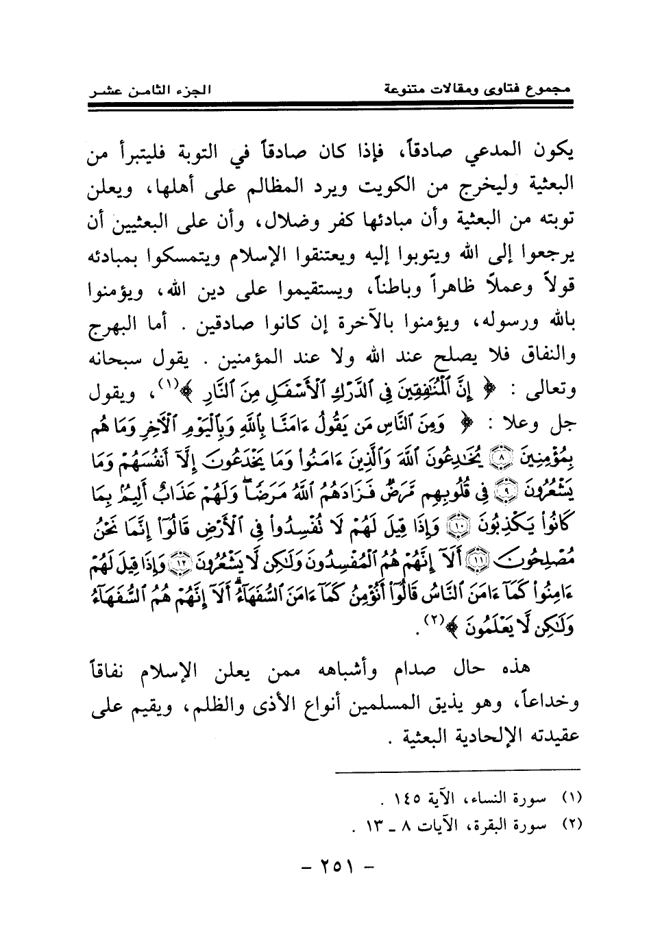 يكون المدعي صادقا، فإذا كان صادقا في التوبة فليتبرأ من البعثية وليخرج من الكويت ويرد المظالم على أهلها، ويعلن توبته من البعثية وأن مبادئها كفر وضلال، وأن على البعثيين أن يرجعوا إلى الله ويتوبوا إليه، ويعتنقوا الإسلام، ويتمسكوا بمبادئه قولا وعملا ظاهرا وباطنا، ويستقيموا على دين الله، ويؤمنوا بالله ورسوله، ويؤمنوا بالآخرة إن كانوا صادقين.