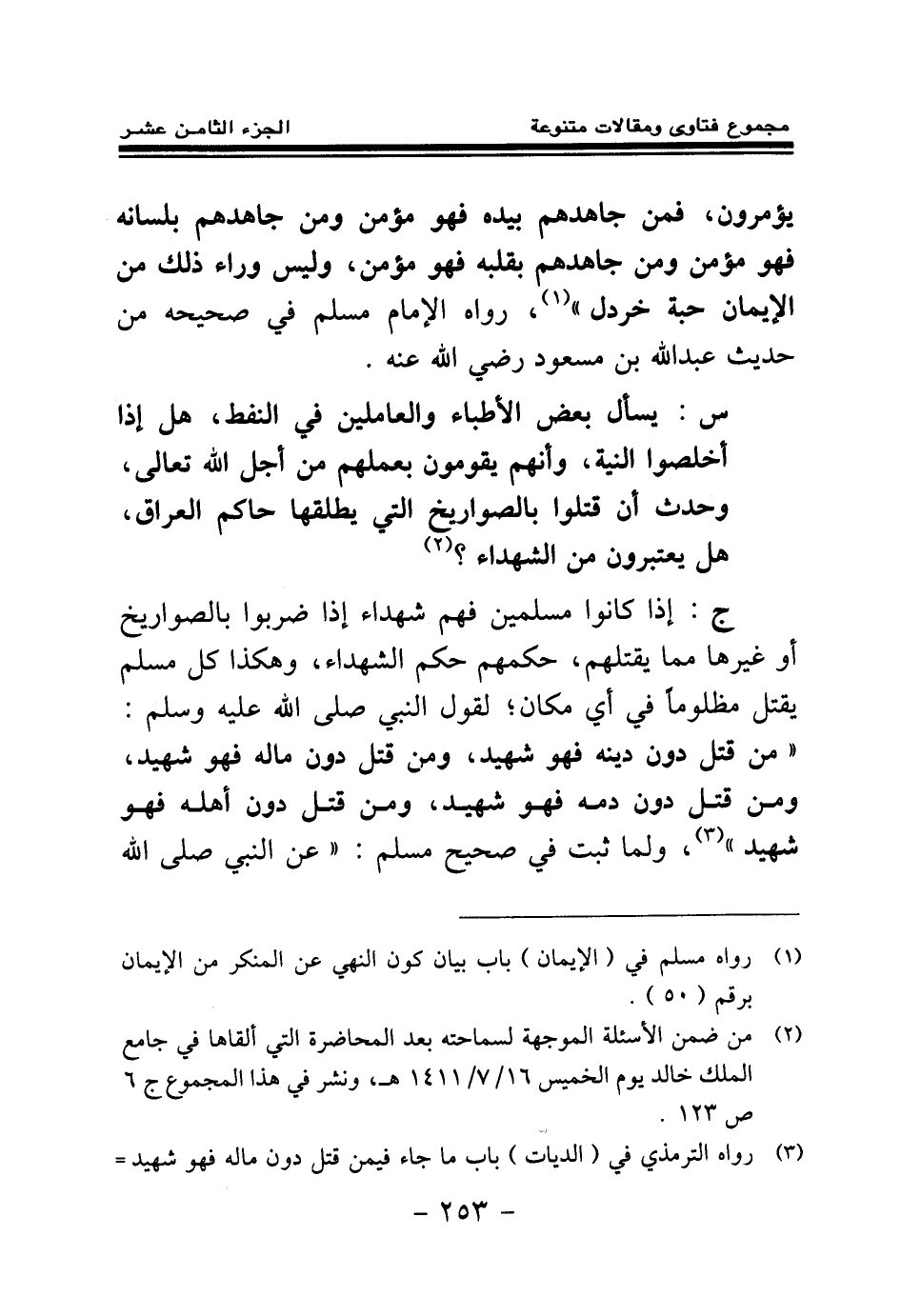 س 8: يسأل بعض الأطباء والعاملين في النفط، هل إذا أخلصوا النية، وأنهم يقومون بعملهم من أجل الله تعالى، وحدث أن قتلوا بالصواريخ التي يطلقها حاكم العراق، هل يعتبروا من الشهداء؟
