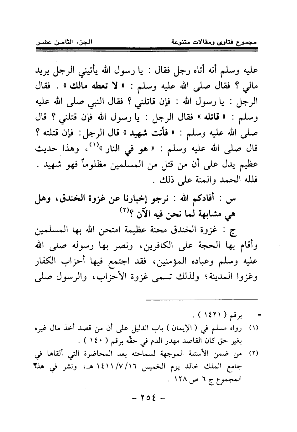 عليه وسلم-: أنه أتاه رجل فقال «يا رسول الله يأتيني الرجل يريد مالي فقال - صلى الله عليه وسلم -: لا تعطه مالك، فقال الرجل: يا رسول الله فإن قاتلني؟ فقال النبي - صلى الله عليه وسلم-: قاتله، فقال الرجل: يا رسول الله فإن قتلني؟ قال: فأنت شهيد، قال الرجل فإن قتلته؟ قال- صلى الله عليه وسلم - هو في النار (¬1) » .