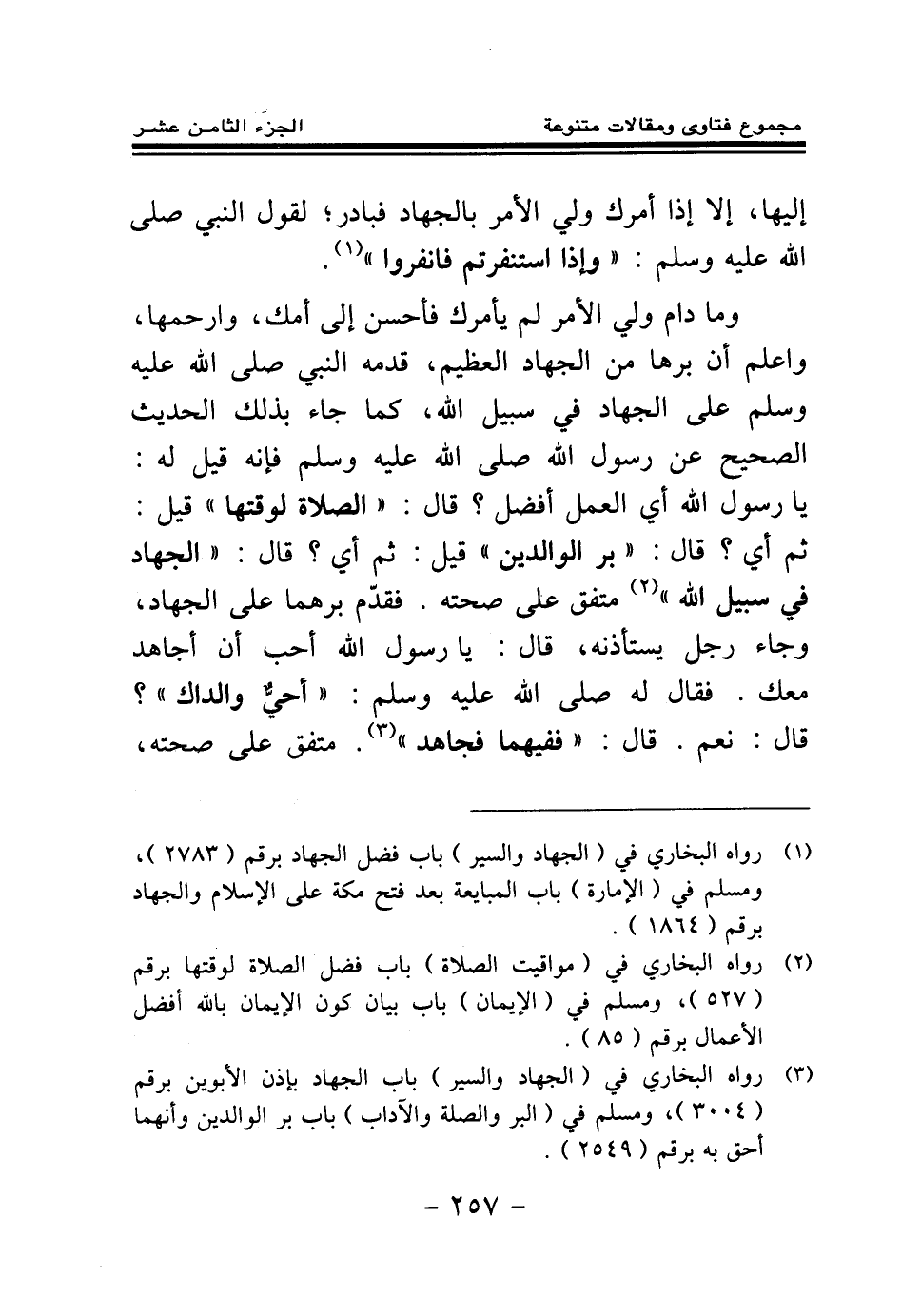 وما دام ولي الأمر لم يأمرك فأحسن إلى أمك، وارحمها، واعلم أن برها من الجهاد العظيم، قدمه النبي - صلى الله عليه وسلم - على الجهاد في سبيل الله، كما جاء بذلك الحديث الصحيح عن رسول الله - صلى الله عليه وسلم - فإنه قيل له: «يا رسول الله أي العمل أفضل؟ قال: إيمان بالله ورسوله، قيل ثم أي؟ قال: بر الوالدين، قيل: ثم أي؟ قال: الجهاد في سبيل الله (¬2) » . متفق على صحته. فقدم برهما على الجهاد.