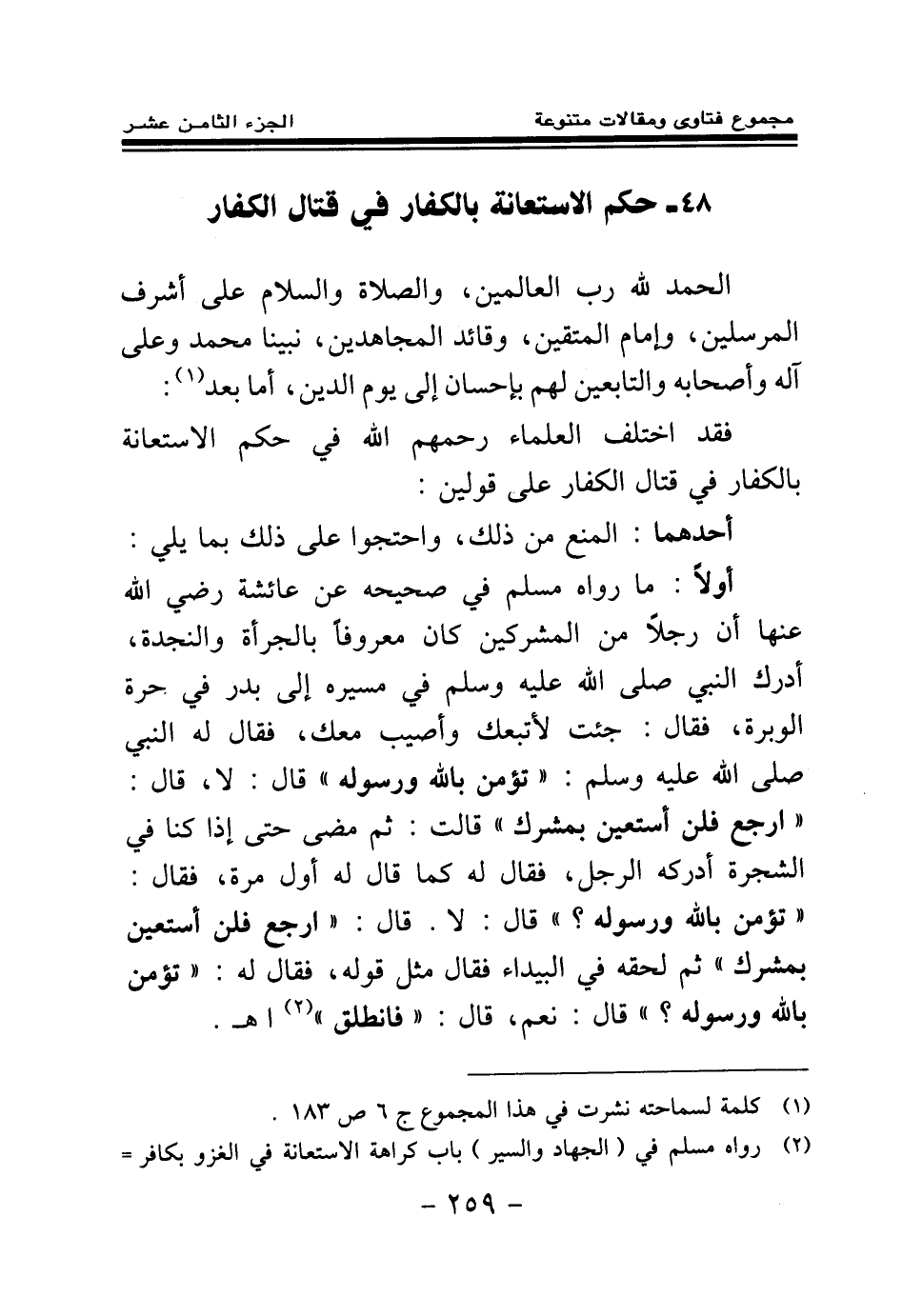 (¬2) رواه مسلم في (الجهاد والسير) باب كراهة الاستعانة في الغزو بكافر برقم (1817) .