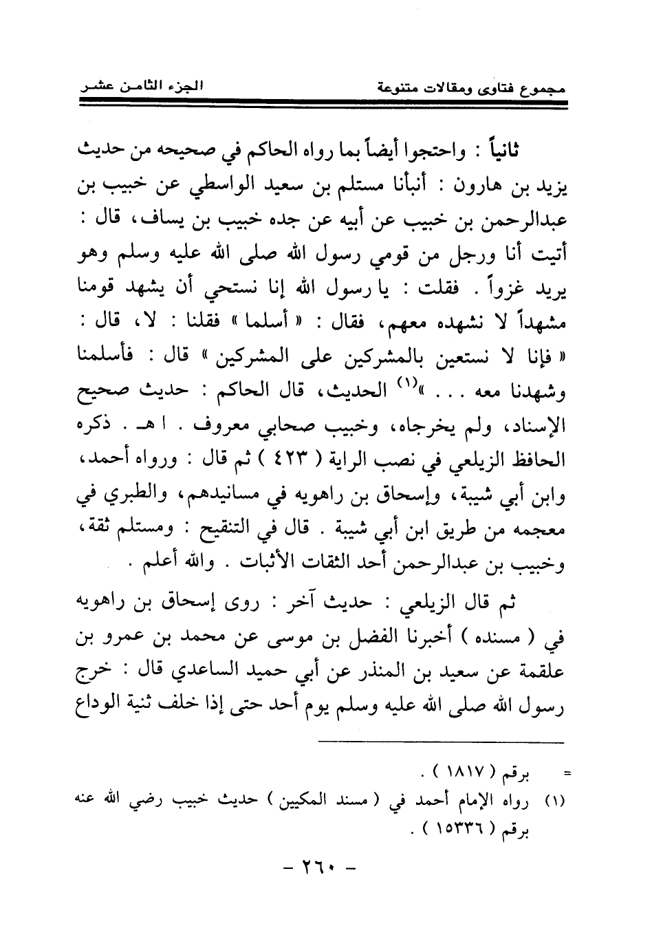 ثانيا: واحتجوا أيضا بما رواه الحاكم في صحيحه من حديث يزيد بن هارون: أنبأنا مستلم بن سعيد الواسطي عن خبيب بن عبد الرحمن بن خبيب عن أبيه عن جده خبيب بن يساف، قال: «أتيت أنا ورجل من قومي رسول الله صلى الله عليه وسلم وهو يريد غزوا. فقلت: يا رسول الله إنا نستحي أن يشهد قومنا مشهدا لا نشهده معهم، فقال: " أسلما " فقلنا: لا، قال: " فإنا لا نستعين بالمشركين على المشركين " قال: فأسلمنا وشهدنا معه (¬1) » . . . الحديث، قال الحاكم: حديث صحيح الإسناد، ولم يخرجاه، وخبيب صحابي معروف اهـ. ذكره الحافظ الزيلعي في نصب الراية (423) ثم قال: ورواه أحمد، وابن أبي شيبة، وإسحاق بن راهويه في مسانيدهم، والطبري في معجمه من طريق ابن أبي شيبة. قال في التنقيح: ومستلم ثقة، وخبيب بن عبد الرحمن أحد الثقات الأثبات. والله أعلم.
