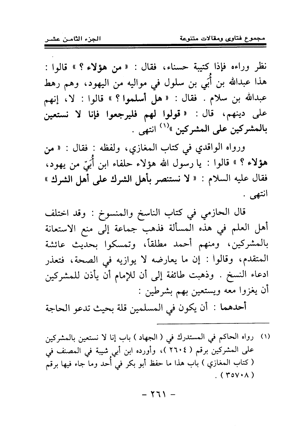 ورواه الواقدي في كتاب المغازي، ولفظه: «فقال: " من هؤلاء؟ " قالوا: يا رسول الله هؤلاء حلفاء ابن أبي من يهود، فقال عليه السلام: " لا نستنصر بأهل الشرك على أهل الشرك» انتهى.