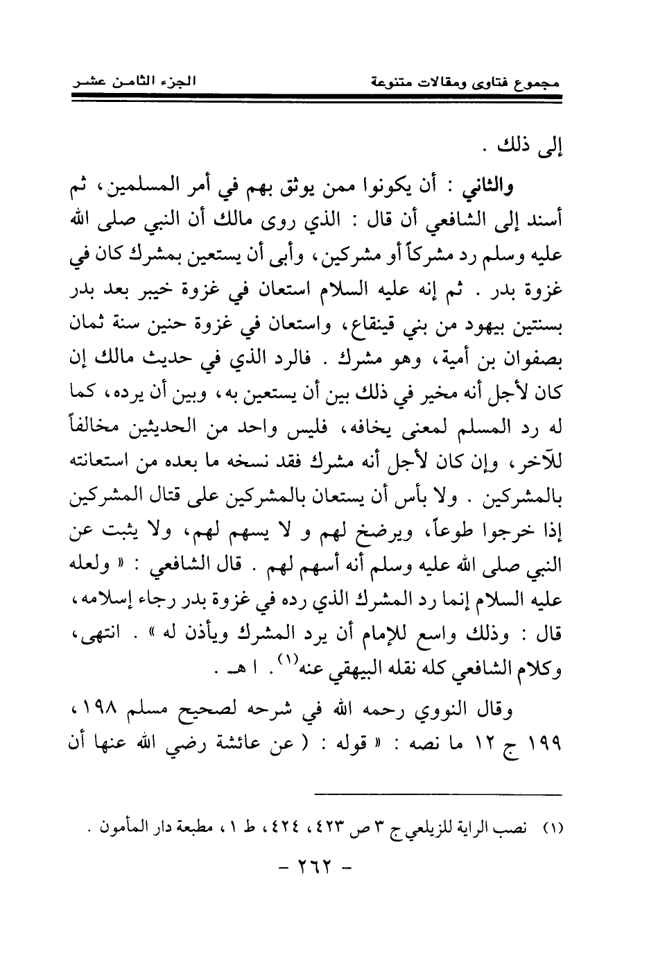 والثاني: أن يكونوا ممن يوثق بهم في أمر المسلمين، ثم أسند إلى الشافعي أن قال: الذي روى مالك أن النبي صلى الله عليه وسلم رد مشركا أو مشركين، وأبى أن يستعين بمشرك كان في غزوة بدر. ثم إنه عليه السلام استعان في غزوة خيبر بعد بدر بسنتين بيهود من بني قينقاع، واستعان في غزوة حنين سنة ثمان بصفوان بن أمية، وهو مشرك. فالرد الذي في حديث مالك إن كان لأجل أنه مخير في ذلك بين أن يستعين به، وبين أن يرده، كما له رد المسلم لمعنى يخافه، فليس واحد من الحديثين مخالفا للآخر، وإن كان لأجل أنه مشرك فقد نسخه ما بعده من استعانته بالمشركين. ولا بأس أن يستعان بالمشركين على قتال المشركين إذا خرجوا طوعا، ويرضخ لهم ولا يسهم لهم، ولا يثبت عن النبي صلى الله عليه وسلم أنه أسهم لهم. قال الشافعي: " ولعله عليه السلام إنما رد المشرك الذي رده في غزوة بدر رجاء إسلامه، قال: وذلك واسع للإمام أن يرد المشرك ويأذن له ". انتهى، وكلام الشافعي كله نقله البيهقي عنه (¬1) اهـ.
