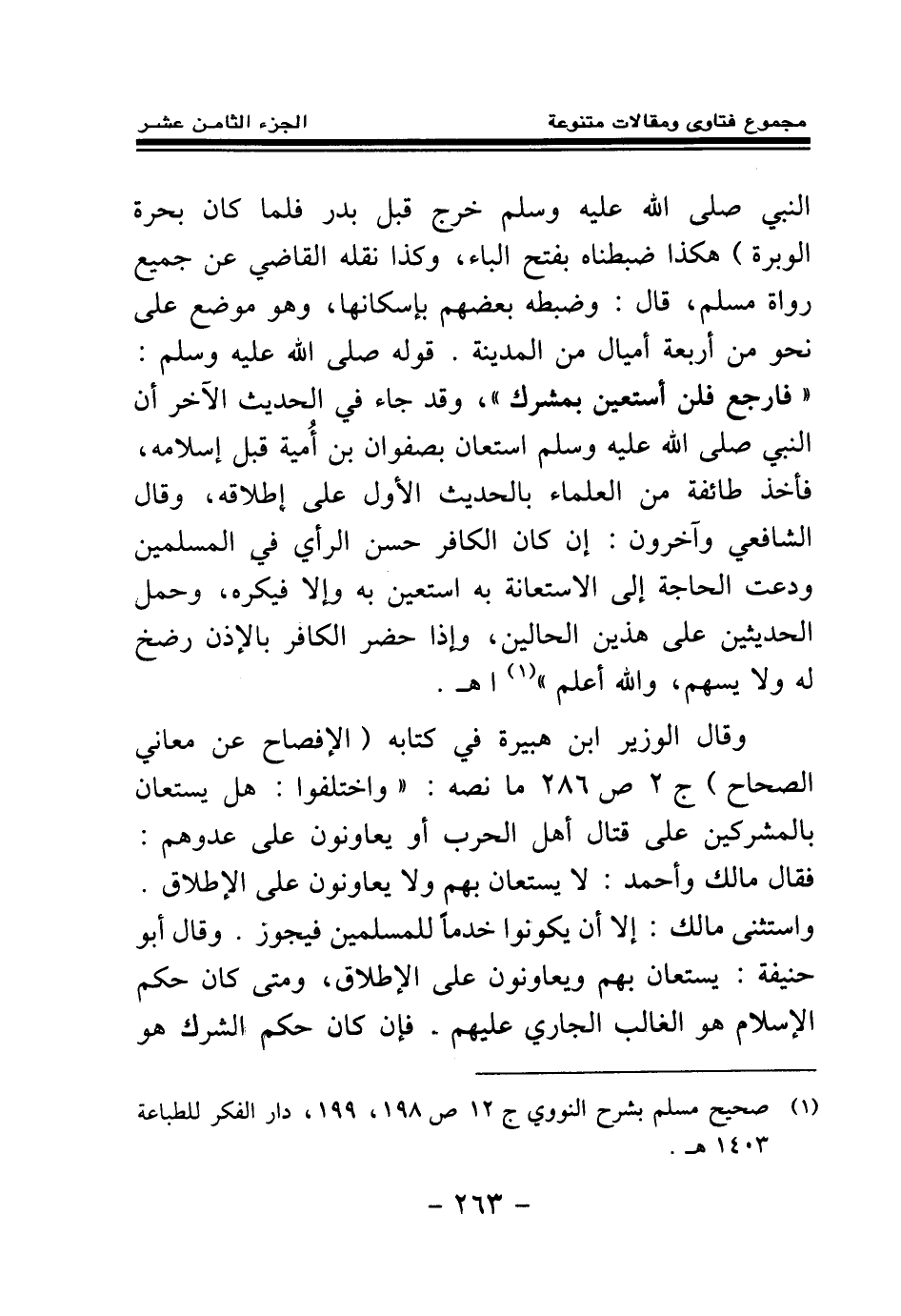 وقال الوزير ابن هبيرة في كتابه (الإفصاح عن معاني الصحاح) ج 2 ص 281 ما نصه: " واختلفوا: هل يستعان بالمشركين على قتال أهل الحرب أو يعاونون على عدوهم: فقال مالك وأحمد: لا يستعان بهم ولا يعاونون على الإطلاق. واستثنى مالك: إلا أن يكونوا خدما للمسلمين فيجوز. وقال أبو حنيفة: يستعان بهم ويعاونون على الإطلاق، ومتى كان حكم الإسلام هو الغالب الجاري عليهم. فإن كان حكم الشرك هو