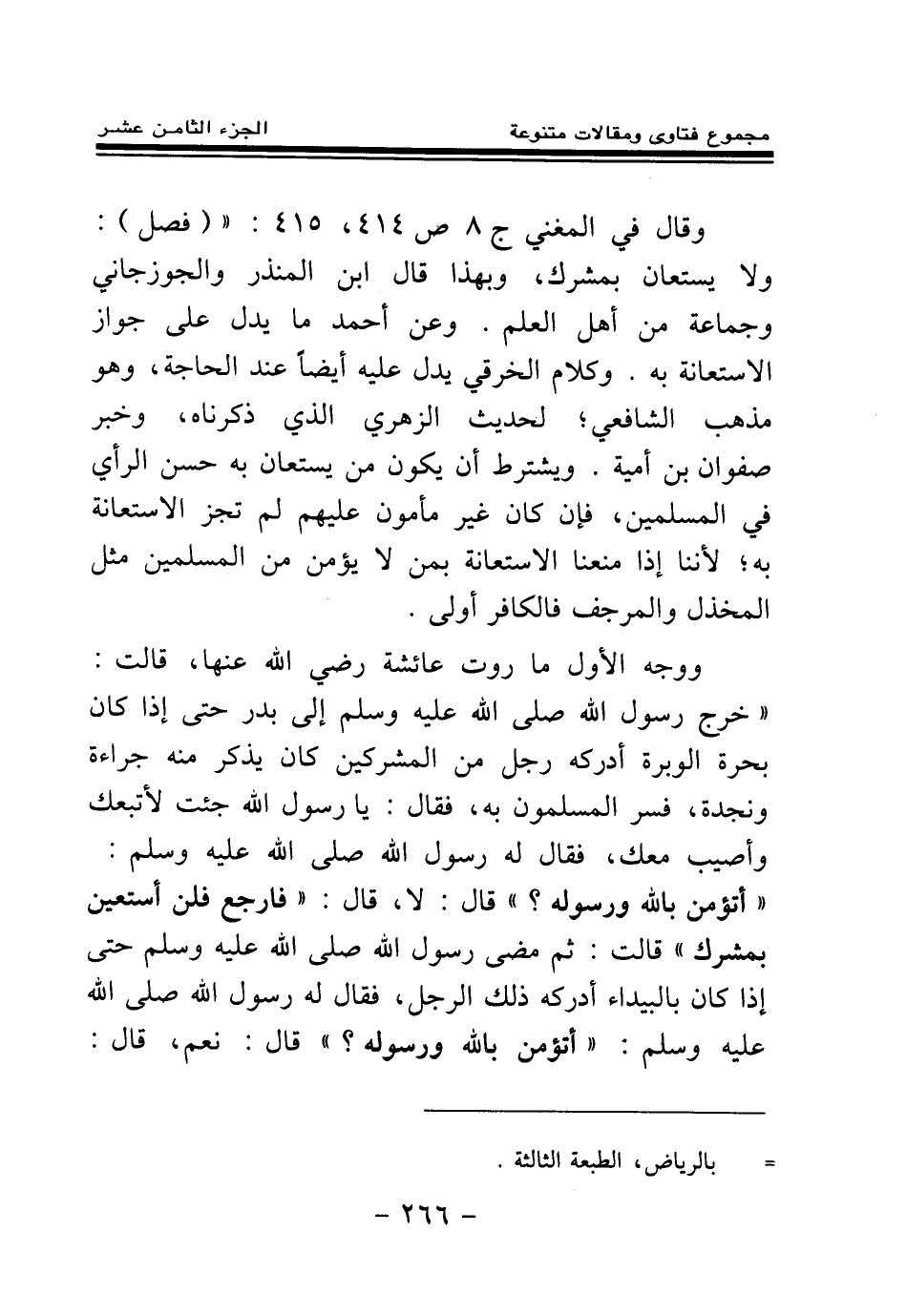 ووجه الأول ما روت عائشة رضي الله عنها، قالت: «خرج رسول الله صلى الله عليه وسلم إلى بدر حتى إذا كان بحرة الوبرة أدركه رجل من المشركين كان يذكر منه جراءة ونجدة، فسر المسلمون به، فقال: يا رسول الله جئت لأتبعك وأصيب معك، فقال له رسول الله صلى الله عليه وسلم: أتؤمن بالله ورسوله؟ ، قال: لا، قال: فارجع فلن أستعين بمشرك، قالت: ثم مضى رسول الله صلى الله عليه وسلم حتى إذا كان بالبيداء أدركه ذلك الرجل، فقال له رسول الله صلى الله عليه وسلم: أتؤمن بالله ورسوله؟ ، قال: نعم، قال: