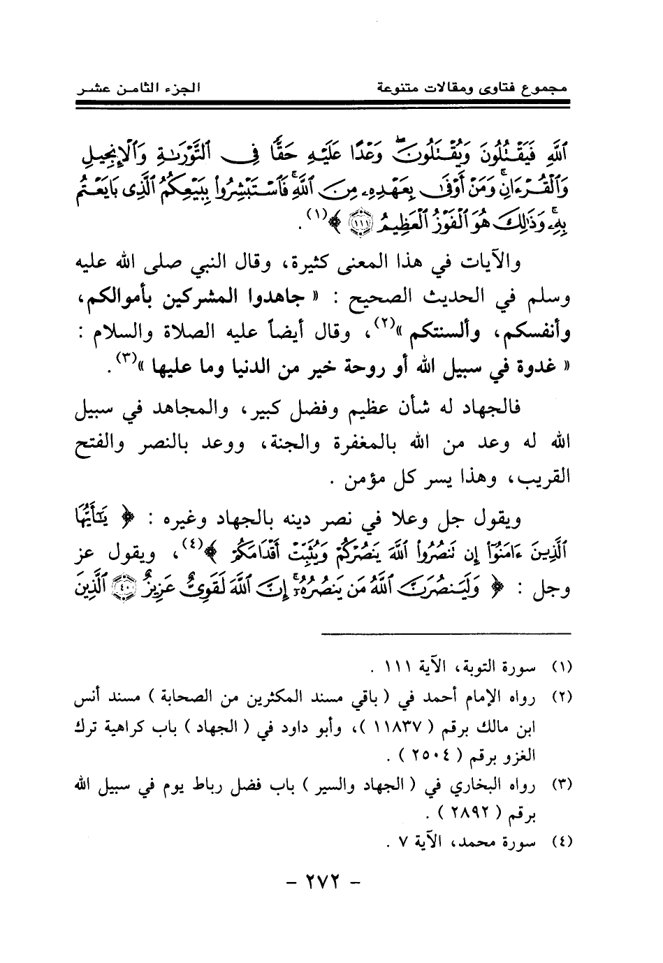 والآيات في هذا المعنى كثيرة، وقال النبي صلى الله عليه وسلم في الحديث الصحيح: «جاهدوا المشركين بأموالكم، وأنفسكم، وألسنتكم (¬1) » ، وقال أيضا عليه الصلاة والسلام: «غدوة في سبيل الله أو روحة خير من الدنيا وما عليها (¬2) » .
