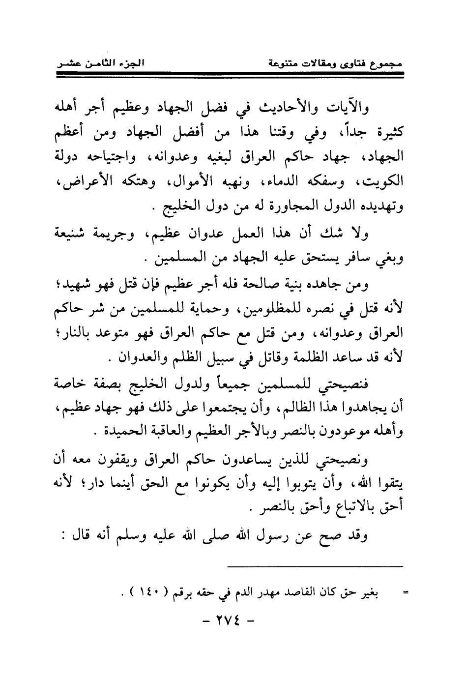 والآيات والأحاديث في فضل الجهاد وعظيم أجر أهله كثيرة جدا، وفي وقتنا هذا من أفضل الجهاد ومن أعظم الجهاد، جهاد حاكم العراق لبغيه وعدوانه، واجتياحه دولة الكويت، وسفكه الدماء، ونهبه الأموال، وهتكه الأعراض، وتهديده الدول المجاورة له من دول الخليج.