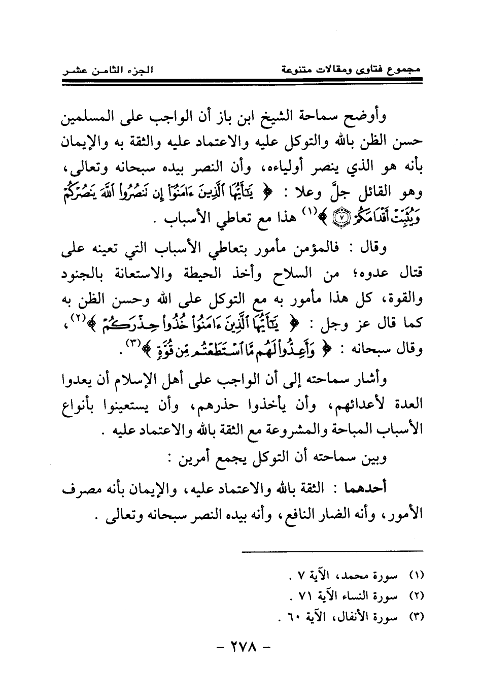 وأوضح سماحة الشيخ ابن باز أن الواجب على المسلمين حسن الظن بالله والتوكل عليه والاعتماد عليه والثقة به والإيمان بأنه هو الذي ينصر أولياءه، وأن النصر بيده سبحانه وتعالى، وهو القائل جل وعلا: {يَا أَيُّهَا الَّذِينَ آمَنُوا إِنْ تَنْصُرُوا اللَّهَ يَنْصُرْكُمْ وَيُثَبِّتْ أَقْدَامَكُمْ} (¬1) هذا مع تعاطي الأسباب.