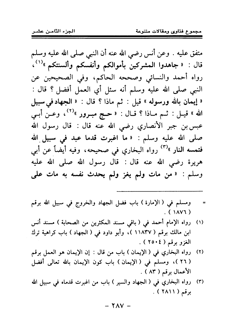 متفق عليه، وعن أنس - رضي الله عنه - أن النبي صلى الله عليه وسلم قال: «جاهدوا المشركين بأموالكم وأنفسكم وألسنتكم (¬1) » . رواه أحمد والنسائي وصححه الحاكم، وفي الصحيحين عن النبي صلى الله عليه وسلم أنه سئل «أي العمل أفضل؟ قال: إيمان بالله ورسوله، قيل: ثم ماذا؟ قال: الجهاد في سبيل الله، قيل ثم ماذا؟ قال: حج مبرور (¬2) » .،