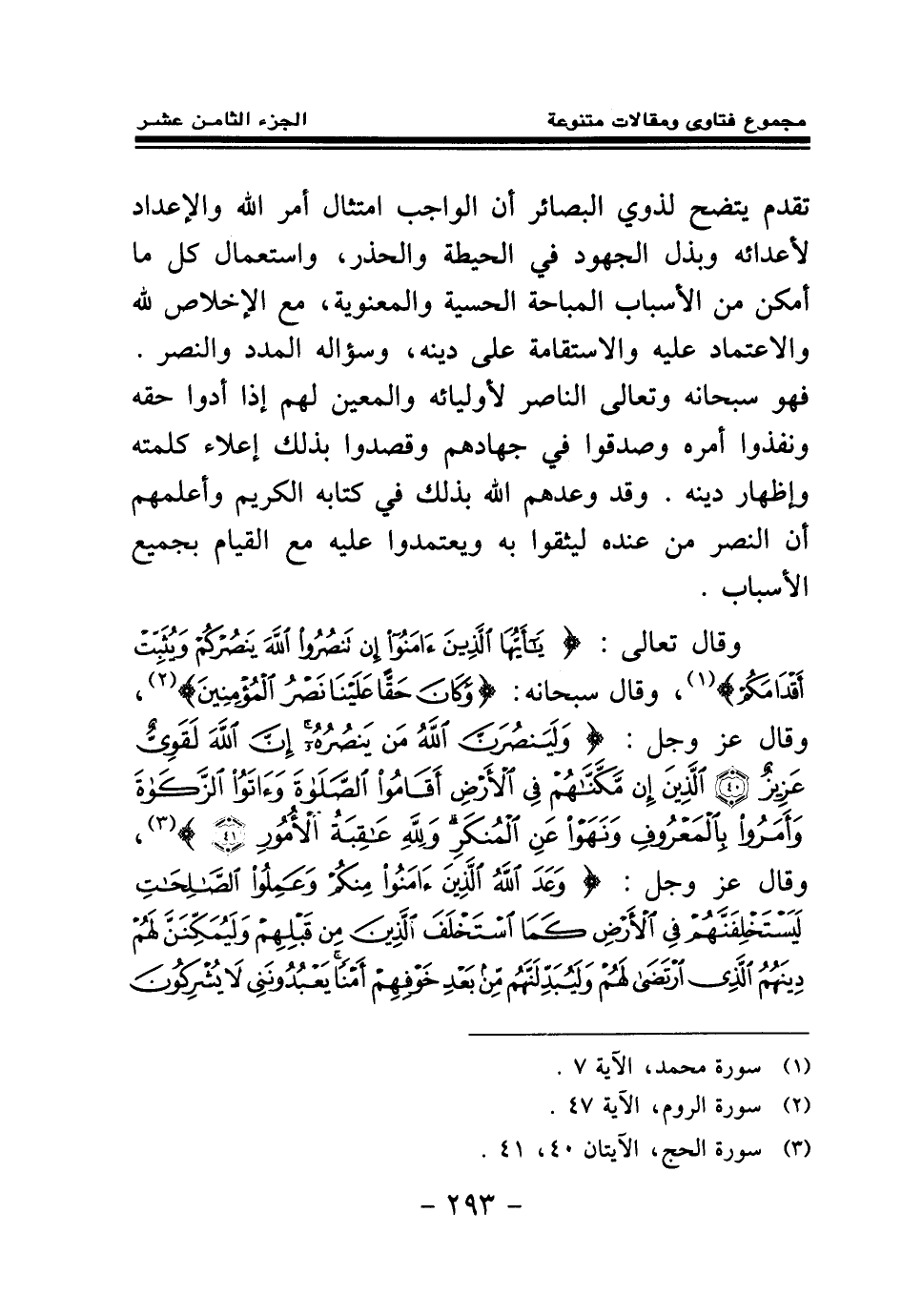وقال تعالى: {يَا أَيُّهَا الَّذِينَ آمَنُوا إِنْ تَنْصُرُوا اللَّهَ يَنْصُرْكُمْ وَيُثَبِّتْ أَقْدَامَكُمْ} (¬1) وقال سبحانه: {وَكَانَ حَقًّا عَلَيْنَا نَصْرُ الْمُؤْمِنِينَ} (¬2) وقال عز وجل: {وَلَيَنْصُرَنَّ اللَّهُ مَنْ يَنْصُرُهُ إِنَّ اللَّهَ لَقَوِيٌّ عَزِيزٌ} (¬3) {الَّذِينَ إِنْ مَكَّنَّاهُمْ فِي الْأَرْضِ أَقَامُوا الصَّلَاةَ وَآتَوُا الزَّكَاةَ وَأَمَرُوا بِالْمَعْرُوفِ وَنَهَوْا عَنِ الْمُنْكَرِ وَلِلَّهِ عَاقِبَةُ الْأُمُورِ} (¬4) وقال عز وجل: {وَعَدَ اللَّهُ الَّذِينَ آمَنُوا مِنْكُمْ وَعَمِلُوا الصَّالِحَاتِ لَيَسْتَخْلِفَنَّهُمْ فِي الْأَرْضِ كَمَا اسْتَخْلَفَ الَّذِينَ مِنْ قَبْلِهِمْ وَلَيُمَكِّنَنَّ لَهُمْ دِينَهُمُ الَّذِي ارْتَضَى لَهُمْ وَلَيُبَدِّلَنَّهُمْ مِنْ بَعْدِ خَوْفِهِمْ أَمْنًا يَعْبُدُونَنِي لَا يُشْرِكُونَ بِي شَيْئًا} (¬5)