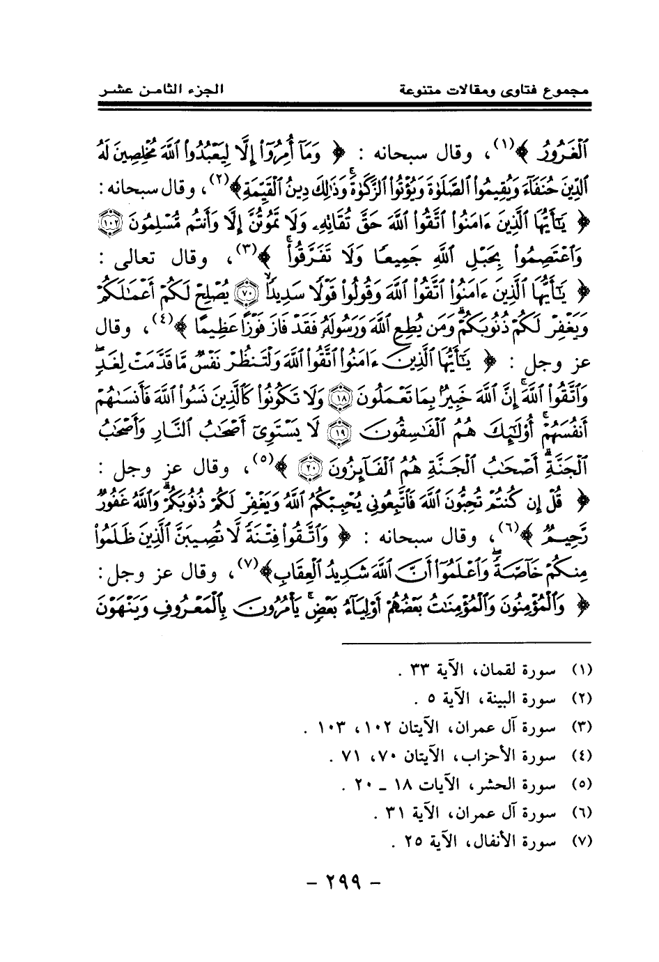 وقال سبحانه: {وَمَا أُمِرُوا إِلَّا لِيَعْبُدُوا اللَّهَ مُخْلِصِينَ لَهُ الدِّينَ حُنَفَاءَ وَيُقِيمُوا الصَّلَاةَ وَيُؤْتُوا الزَّكَاةَ وَذَلِكَ دِينُ الْقَيِّمَةِ} (¬1) وقال سبحانه: {يَا أَيُّهَا الَّذِينَ آمَنُوا اتَّقُوا اللَّهَ حَقَّ تُقَاتِهِ وَلَا تَمُوتُنَّ إِلَّا وَأَنْتُمْ مُسْلِمُونَ} (¬2) {وَاعْتَصِمُوا بِحَبْلِ اللَّهِ جَمِيعًا وَلَا تَفَرَّقُوا} (¬3) وقال تعالى: {يَا أَيُّهَا الَّذِينَ آمَنُوا اتَّقُوا اللَّهَ وَقُولُوا قَوْلًا سَدِيدًا} (¬4) {يُصْلِحْ لَكُمْ أَعْمَالَكُمْ وَيَغْفِرْ لَكُمْ ذُنُوبَكُمْ وَمَنْ يُطِعِ اللَّهَ وَرَسُولَهُ فَقَدْ فَازَ فَوْزًا عَظِيمًا} (¬5)
