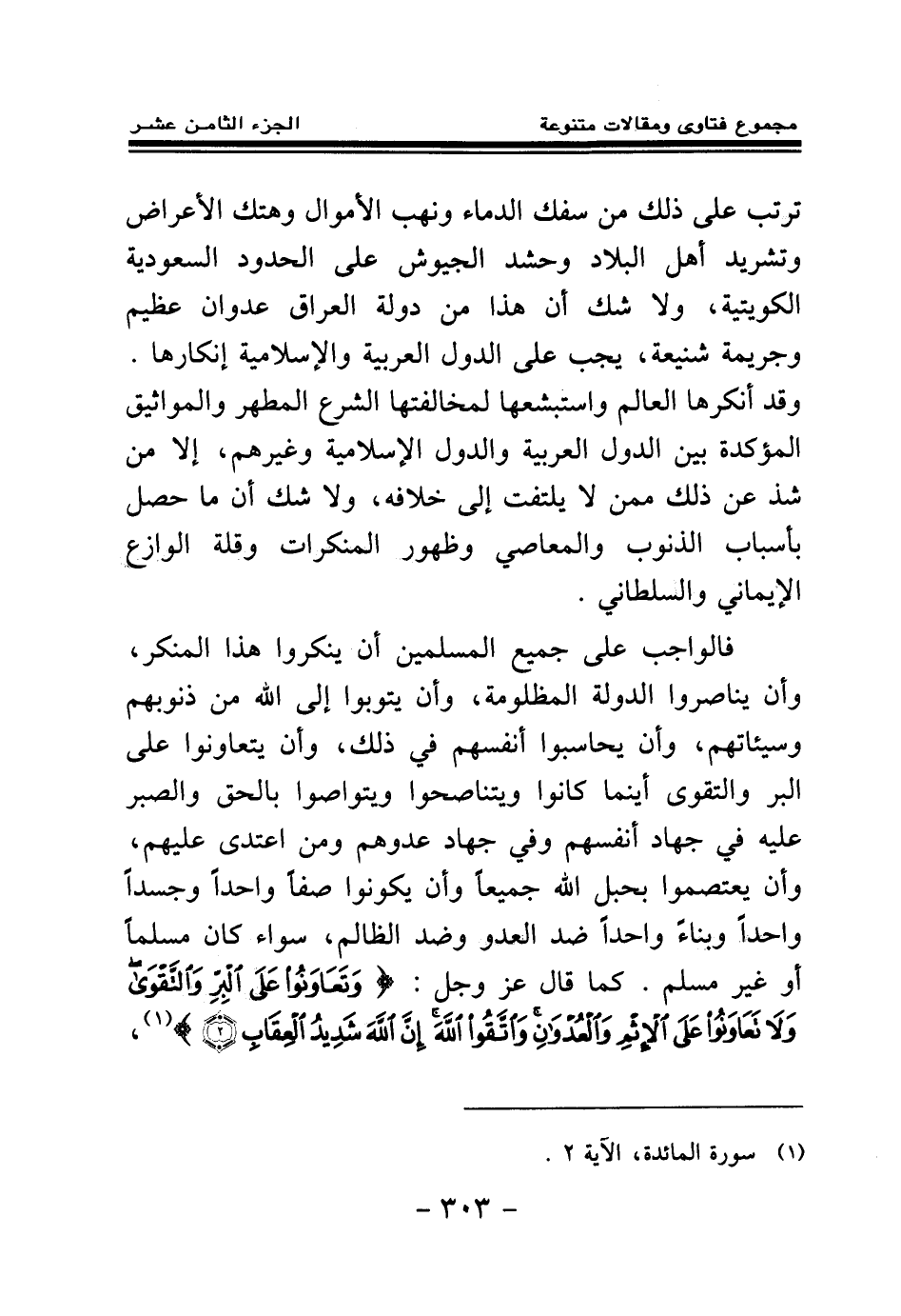 فالواجب على جميع المسلمين أن ينكروا هذا المنكر، وأن يناصروا الدولة المظلومة، وأن يتوبوا إلى الله من ذنوبهم وسيئاتهم وأن يحاسبوا أنفسهم في ذلك، وأن يتعاونوا على البر والتقوى أينما كانوا ويتناصحوا ويتواصوا بالحق والصبر عليه في جهاد أنفسهم وفى جهاد عدوهم ومن اعتدى عليهم، وأن يعتصموا بحبل الله جميعا وأن يكونوا صفا واحدا وجسدا واحدا وبناء واحدا ضد العدو وضد الظالم، سواء كان مسلما أو غير مسلم. كما قال عز وجل: {وَتَعَاوَنُوا عَلَى الْبِرِّ وَالتَّقْوَى وَلَا تَعَاوَنُوا عَلَى الْإِثْمِ وَالْعُدْوَانِ وَاتَّقُوا اللَّهَ إِنَّ اللَّهَ شَدِيدُ الْعِقَابِ} (¬1)