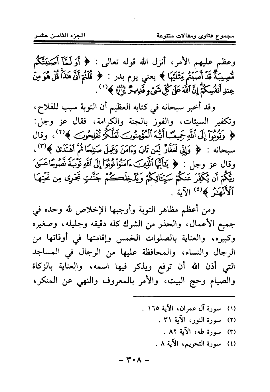 وقد أخبر سبحانه في كتابه العظيم أن التوبة سبب للفلاح وتكفير السيئات، والفوز بالجنة والكرامة، فقال عز وجل: {وَتُوبُوا إِلَى اللَّهِ جَمِيعًا أَيُّهَ الْمُؤْمِنُونَ لَعَلَّكُمْ تُفْلِحُونَ} (¬3) وقال سبحانه: {وَإِنِّي لَغَفَّارٌ لِمَنْ تَابَ وَآمَنَ وَعَمِلَ صَالِحًا ثُمَّ اهْتَدَى} (¬4) وقال عز وجل: {يَا أَيُّهَا الَّذِينَ آمَنُوا تُوبُوا إِلَى اللَّهِ تَوْبَةً نَصُوحًا عَسَى رَبُّكُمْ أَنْ يُكَفِّرَ عَنْكُمْ سَيِّئَاتِكُمْ وَيُدْخِلَكُمْ جَنَّاتٍ تَجْرِي مِنْ تَحْتِهَا الْأَنْهَارُ} (¬5) الآية.