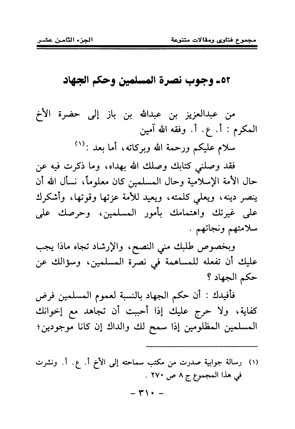 فقد وصلني كتابك وصلك الله بهداه، وما ذكرت فيه عن حال الأمة الإسلامية وحال المسلمين كان معلوما، نسأل الله أن ينصر دينه، ويعلي كلمته، ويعيد للأمة عزتها وقوتها، وأشكرك على غيرتك واهتمامك بأمور المسلمين، وحرصك على سلامتهم ونجاتهم.