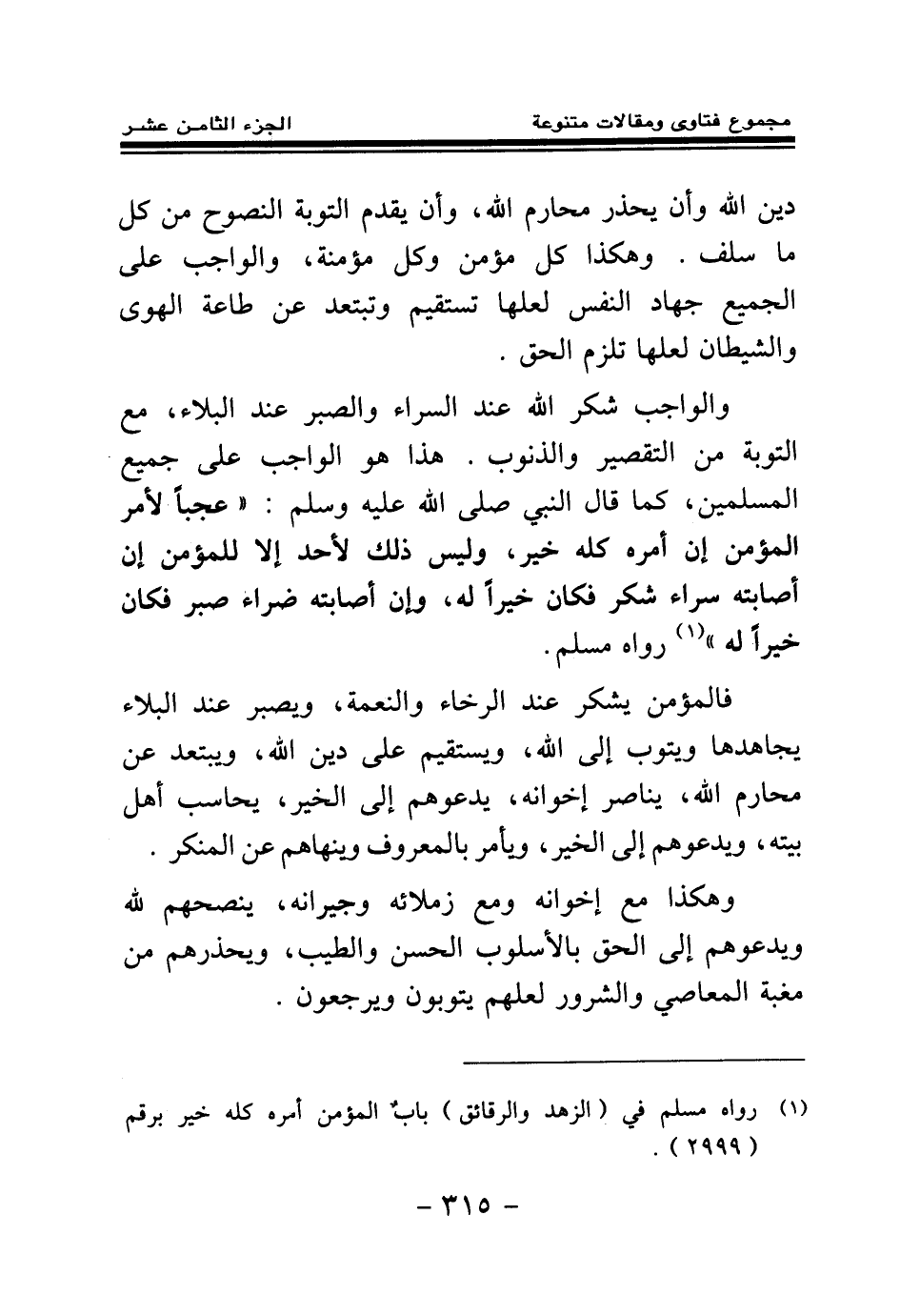 هذا هو الواجب على جميع المسلمين، كما قال النبي - صلى الله عليه وسلم -: «عجبا لأمر المؤمن إن أمره كله له خير وليس ذلك لأحد إلا للمؤمن إن أصابته سراء شكر فكان خيرا له وإن أصابته ضراء صبر فكان خيرا له (¬1) » (¬2) رواه مسلم.