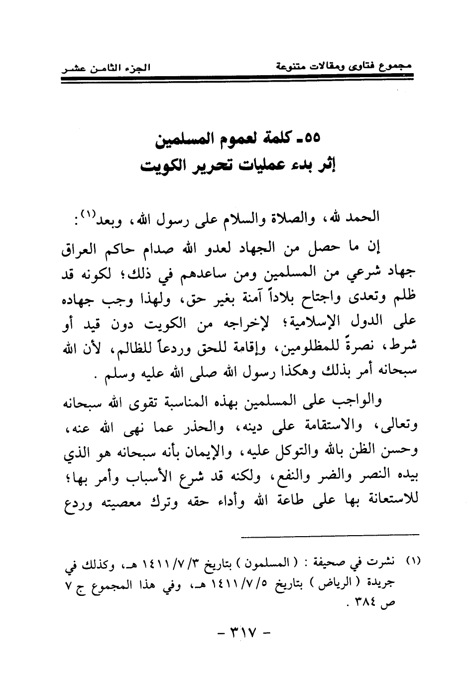 لعموم المسلمين إثر بدء عمليات تحرير الكويت