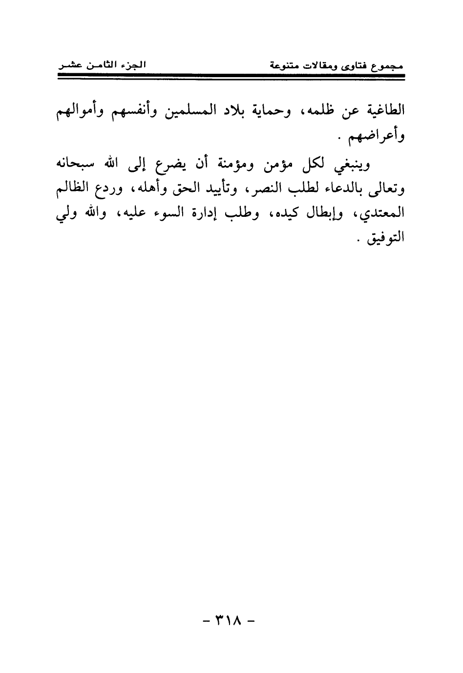 وينبغي لكل مؤمن ومؤمنة أن يضرع إلى الله سبحانه وتعالى بالدعاء لطلب النصر، وتأييد الحق وأهله، وردع الظالم المعتدي وإبطال كيده وطلب إدارة السوء عليه، والله ولي التوفيق.