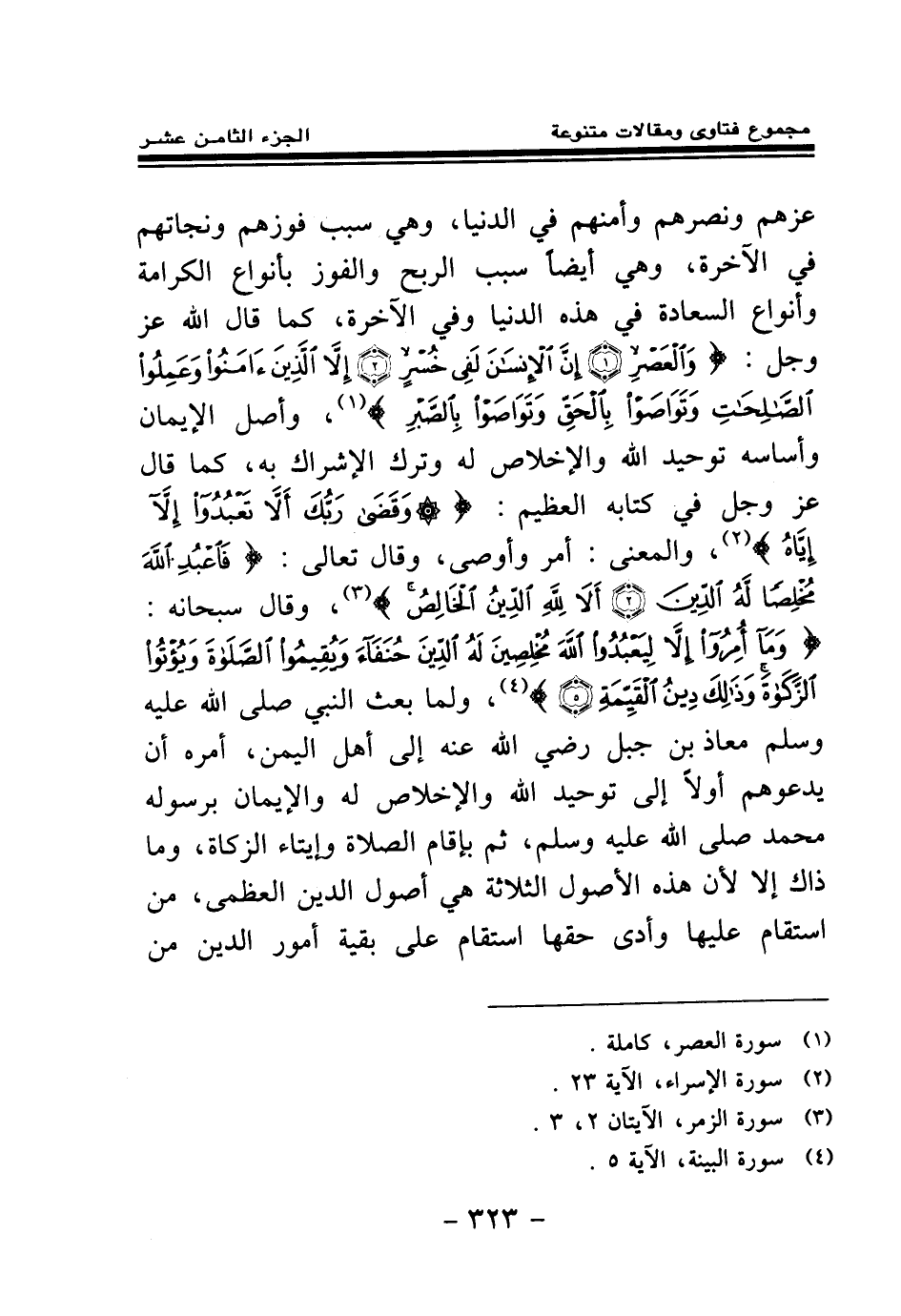 عزهم ونصرهم وأمنهم في الدنيا، وهي سبب فوزهم ونجاتهم في الآخرة، وهي أيضا سبب الربح والفوز بأنواع الكرامة وأنواع السعادة في هذه الدنيا وفي الآخرة، كما قال الله عز وجل: {وَالْعَصْرِ} (¬1) {إِنَّ الْإِنْسَانَ لَفِي خُسْرٍ} (¬2) {إِلَّا الَّذِينَ آمَنُوا وَعَمِلُوا الصَّالِحَاتِ وَتَوَاصَوْا بِالْحَقِّ وَتَوَاصَوْا بِالصَّبْرِ} (¬3) ، وأصل الإيمان وأساسه توحيد الله والإخلاص له وترك الإشراك به، كما قال عز وجل في كتابه العظيم: {وَقَضَى رَبُّكَ أَلَّا تَعْبُدُوا إِلَّا إِيَّاهُ} (¬4) ، والمعنى: أمر وأوصى، وقال تعالى: {فَاعْبُدِ اللَّهَ مُخْلِصًا لَهُ الدِّينَ} (¬5) {أَلَا لِلَّهِ الدِّينُ الْخَالِصُ} (¬6) ، وقال سبحانه: {وَمَا أُمِرُوا إِلَّا لِيَعْبُدُوا اللَّهَ مُخْلِصِينَ لَهُ الدِّينَ حُنَفَاءَ وَيُقِيمُوا الصَّلَاةَ وَيُؤْتُوا الزَّكَاةَ وَذَلِكَ دِينُ الْقَيِّمَةِ} (¬7) .