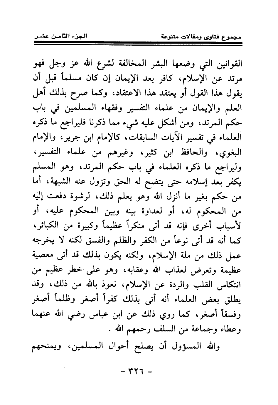 القوانين التي وضعها البشر المخالفة لشرع الله عز وجل فهو مرتد عن الإسلام، كافر بعد الإيمان إن كان مسلما قبل أن يقول هذا القول أو يعتقد هذا الاعتقاد، وكما صرح بذلك أهل العلم والإيمان من علماء التفسير وفقهاء المسلمين في باب حكم المرتد، ومن أشكل عليه شيء مما ذكرنا فليراجع ما ذكره العلماء في تفسير الآيات السابقات، كالإمام ابن جرير، والإمام البغوي، والحافظ ابن كثير، وغيرهم من علماء التفسير، وليراجع ما ذكره العلماء في باب حكم المرتد، وهو المسلم يكفر بعد إسلامه حتى يتضح له الحق وتزول عنه الشبهة.