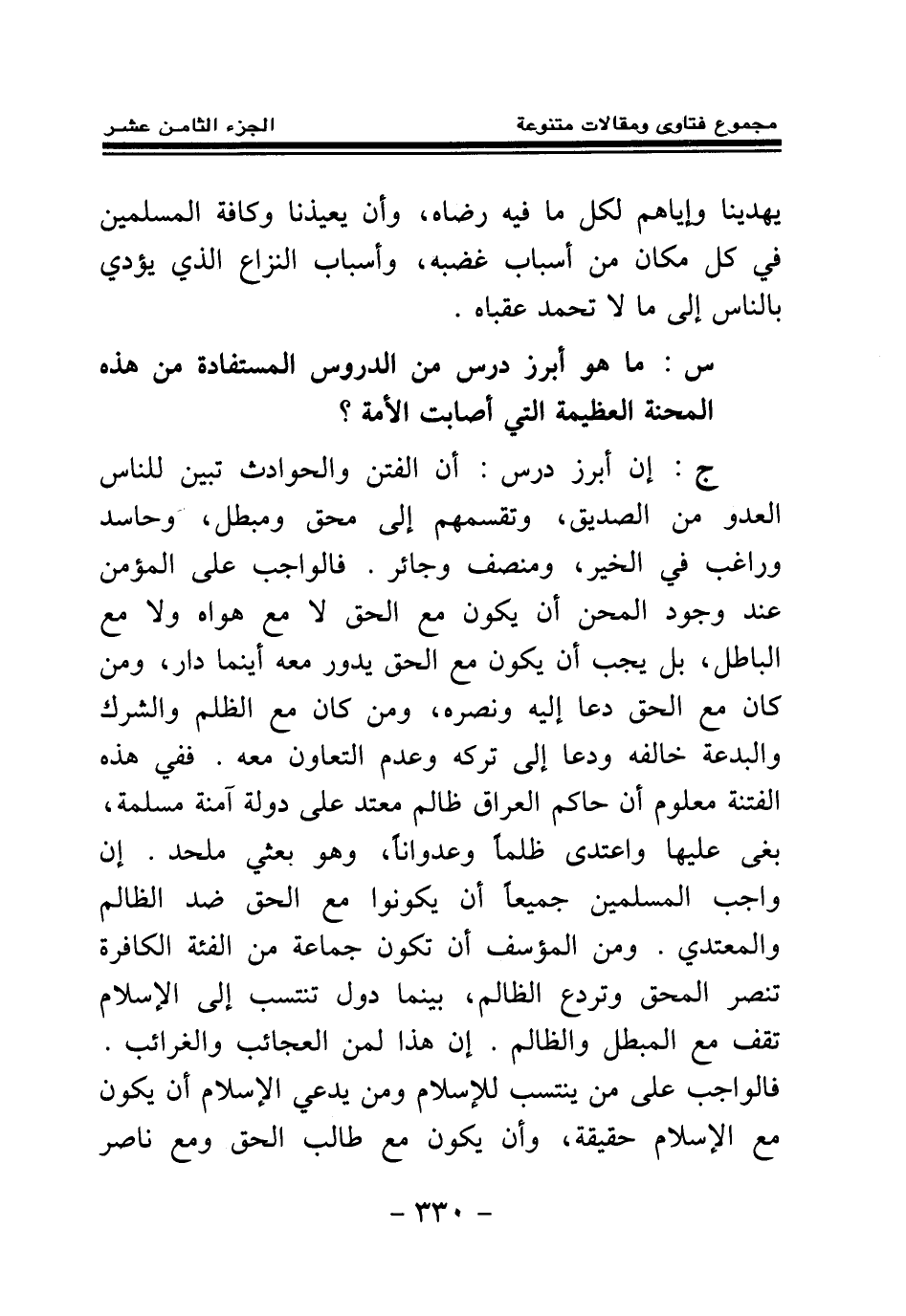 ج: إن أبرز درس: أن الفتن والحوادث تبين للناس العدو من الصديق، وتقسمهم إلى محق ومبطل، وحاسد وراغب في الخير، ومنصف وجائر. فالواجب على المؤمن عند وجود المحن أن يكون مع الحق لا مع هواه ولا مع الباطل، بل يجب أن يكون مع الحق يدور معه أينما دار، ومن كان مع الحق دعا إليه ونصره، ومن كان مع الظلم والشرك والبدعة خالفه ودعا إلى تركه وعدم التعاون معه. ففي هذه الفتنة معلوم أن حاكم العراق ظالم معتد على دولة آمنة مسلمة، بغى عليها واعتدى ظلما وعدوانا، وهو بعثي ملحد. إن واجب المسلمين جميعا أن يكونوا مع الحق ضد الظالم والمعتدي. ومن المؤسف أن تكون جماعة من الفئة الكافرة تنصر المحق وتردع الظالم، بينما دول تنتسب إلى الإسلام تقف مع المبطل والظالم. إن هذا لمن العجائب والغرائب. فالواجب على من ينتسب للإسلام ومن يدعي الإسلام أن يكون مع الإسلام حقيقة، وأن يكون مع طالب الحق ومع ناصر