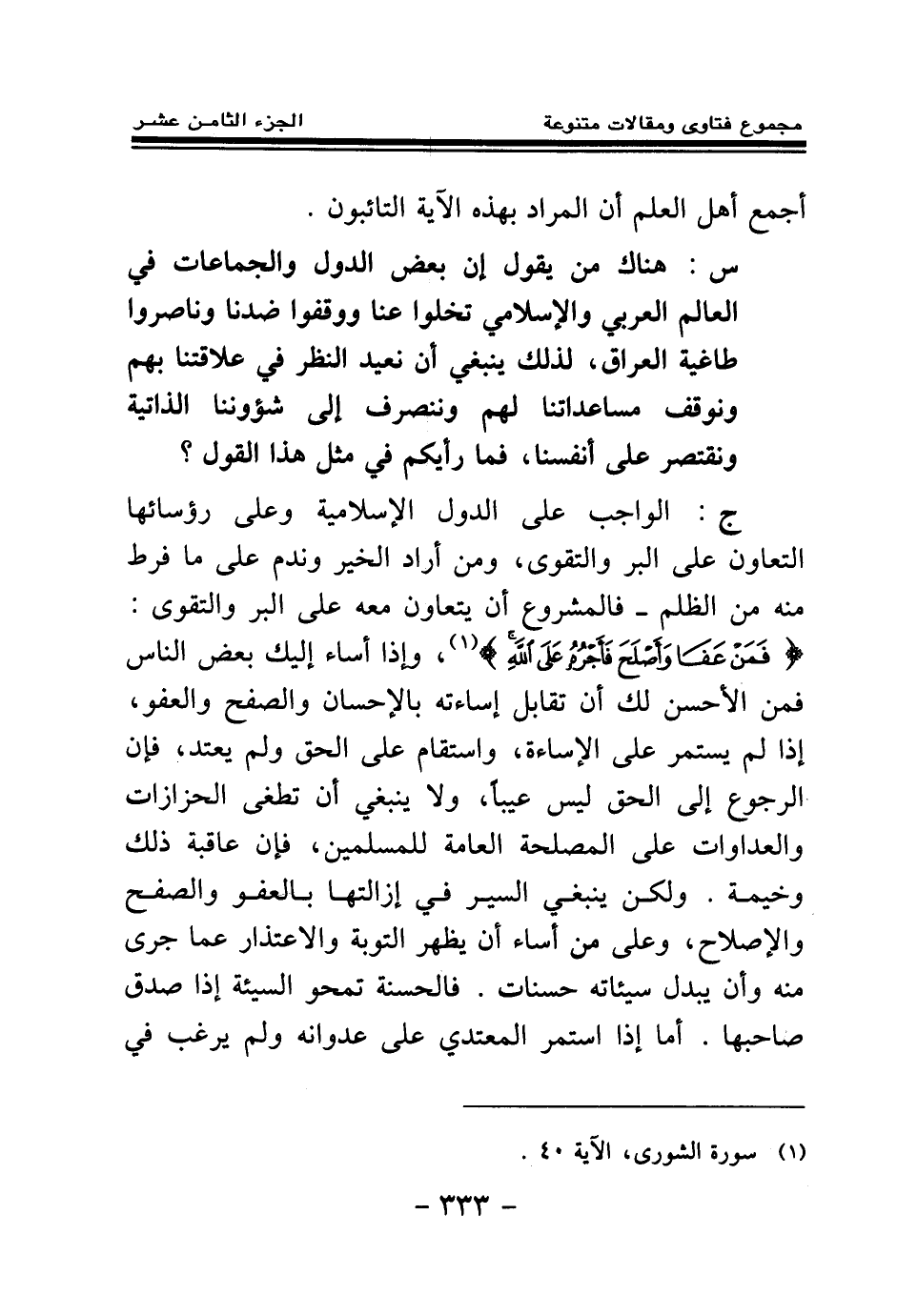 ج: الواجب على الدول الإسلامية وعلى رؤسائها التعاون على البر والتقوى، ومن أراد الخير وندم على ما فرط منه من الظلم- فالمشروع أن يتعاون معه على البر والتقوى: {فَمَنْ عَفَا وَأَصْلَحَ فَأَجْرُهُ عَلَى اللَّهِ} (¬1) ، وإذا أساء إليك بعض الناس فمن الأحسن لك أن تقابل إساءته بالإحسان والصفح والعفو، إذا لم يستمر على الإساءة، واستقام على الحق ولم يعتد، فإن الرجوع إلى الحق ليس عيبا، ولا ينبغي أن تطغى الحزازات والعداوات على المصلحة العامة للمسلمين، فإن عاقبة ذلك وخيمة. ولكن ينبغي السير في إزالتها بالعفو والصفح والإصلاح، وعلى من أساء أن يظهر التوبة والاعتذار عما جرى منه وأن يبدل سيئاته حسنات. فالحسنة تمحو السيئة إذا صدق صاحبها. أما إذا استمر المعتدي على عدوانه ولم يرغب في