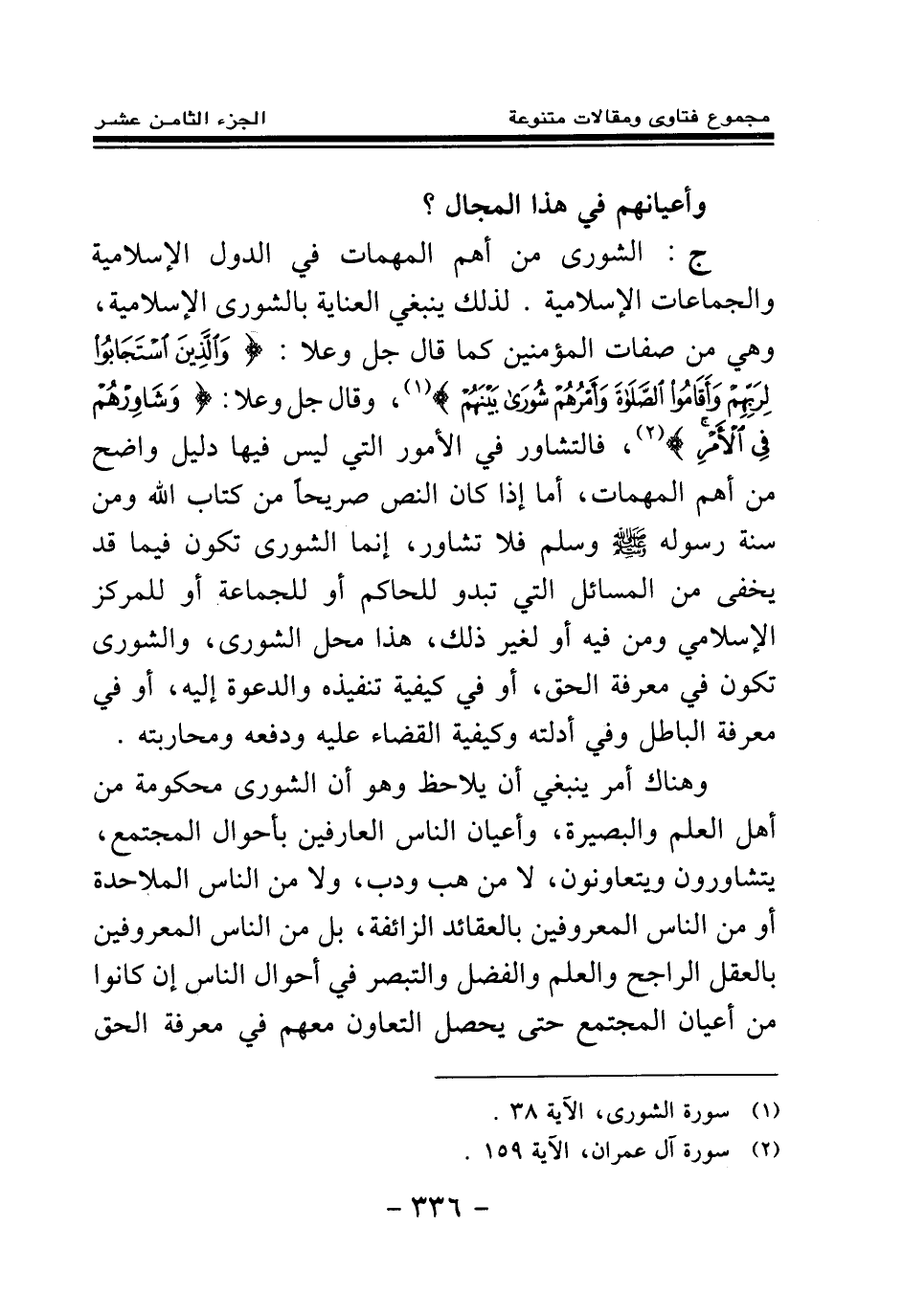 ج: الشورى من أهم المهمات في الدول الإسلامية والجماعات الإسلامية. لذلك ينبغي العناية بالشورى الإسلامية، وهي من صفات المؤمنين كما قال جل وعلا: {وَالَّذِينَ اسْتَجَابُوا لِرَبِّهِمْ وَأَقَامُوا الصَّلَاةَ وَأَمْرُهُمْ شُورَى بَيْنَهُمْ} (¬1) ، وقال جل وعلا: {وَشَاوِرْهُمْ فِي الْأَمْرِ} (¬2) ، فالتشاور في الأمور التي ليس فيها دليل واضح من أهم المهمات، أما إذا كان النص صريحا من كتاب الله ومن سنة رسوله صلى الله عليه وسلم فلا تشاور.