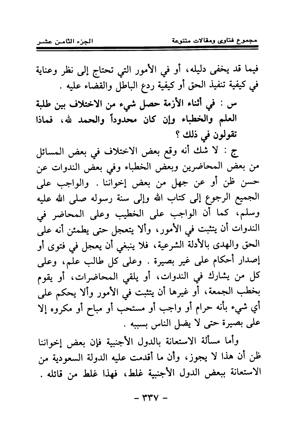 وأما مسألة الاستعانة بالدول الأجنبية فإن بعض إخواننا ظن أن هذا لا يجوز، وأن ما أقدمت عليه الدولة السعودية من الاستعانة ببعض الدول الأجنبية غلط، فهذا غلط من قائله.
