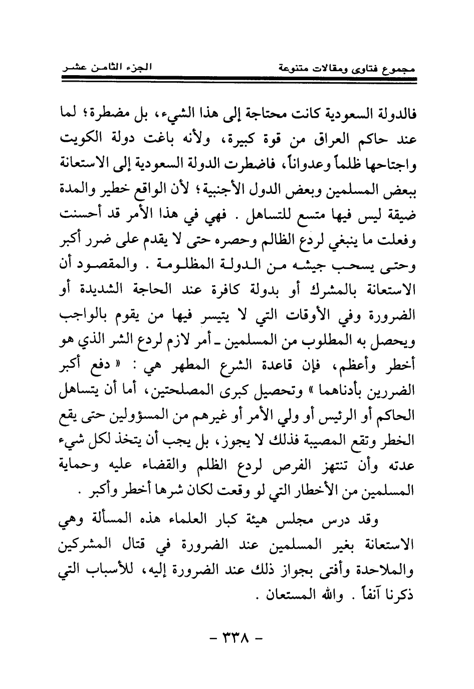 فالدولة السعودية كانت محتاجة إلى هذا الشيء، بل مضطرة؛ لما عند حاكم العراق من قوة كبيرة، ولأنه باغت دولة الكويت واجتاحها ظلما وعدوانا، فاضطرت الدولة السعودية إلى الاستعانة ببعض المسلمين وبعض الدول الأجنبية؛ لأن الواقع خطير والمدة ضيقة ليس فيها متسع للتساهل. فهي في هذا الأمر قد أحسنت وفعلت ما ينبغي لردع الظالم وحصره حتى لا يقدم على ضرر أكبر وحتى يسحب جيشه من الدولة المظلومة. والمقصود أن الاستعانة بالمشرك أو بدولة كافرة عند الحاجة الشديدة أو الضرورة وفي الأوقات التي لا يتيسر فيها من يقوم بالواجب ويحصل به المطلوب من المسلمين- أمر لازم لردع الشر الذي هو أخطر وأعظم، فإن قاعدة الشرع المطهر هي: " دفع أكبر الضررين بأدناهما " وتحصيل كبرى المصلحتين، أما أن يتساهل الحاكم أو الرئيس أو ولي الأمر أو غيرهم من المسئولين حتى يقع الخطر وتقع المصيبة فذلك لا يجوز، بل يجب أن يتخذ لكل شيء عدته وأن تنتهز الفرص لردع الظلم والقضاء عليه وحماية المسلمين من الأخطار التي لو وقعت لكان شرها أخطر وأكبر.