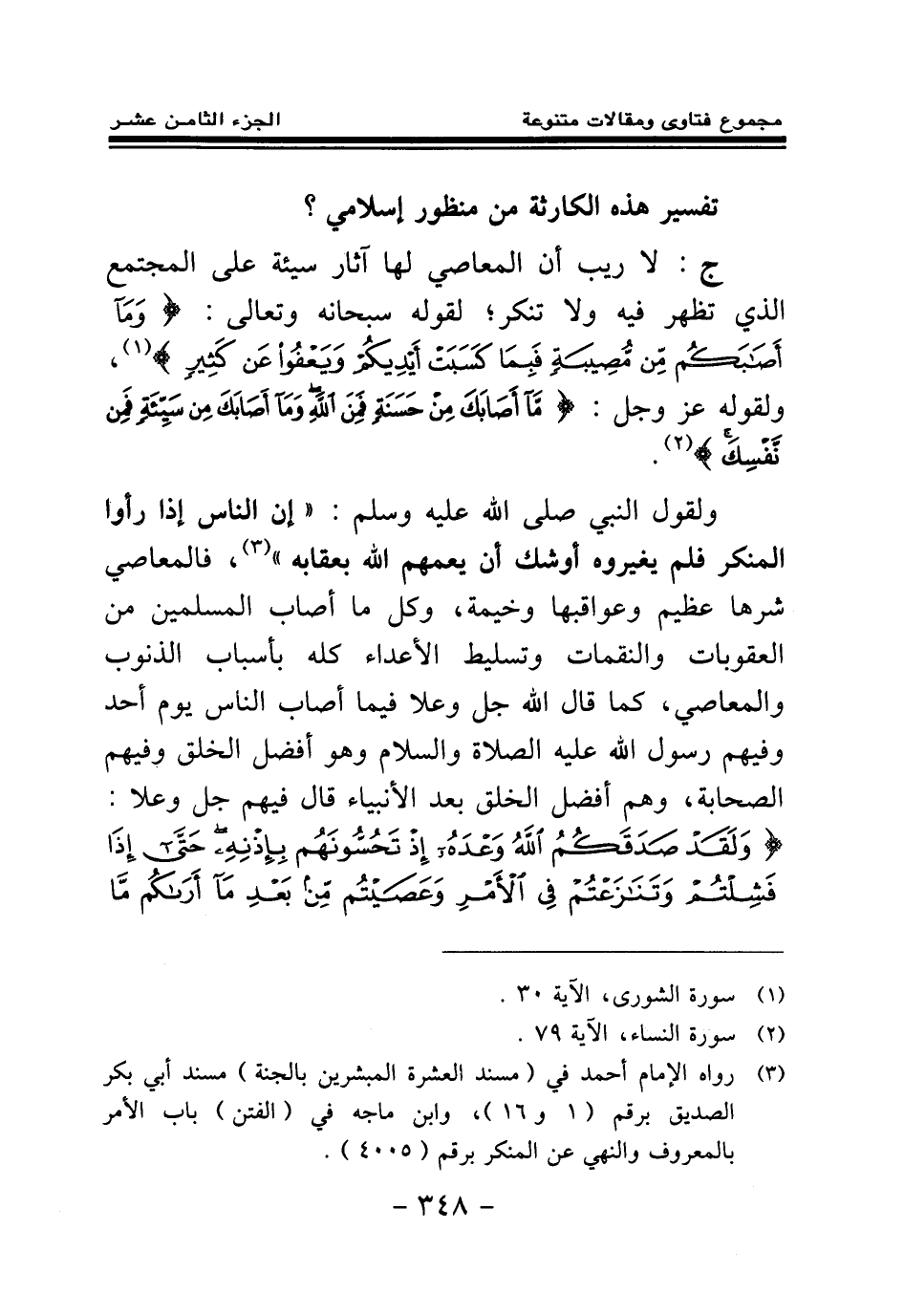 ج: لا ريب أن المعاصي لها آثار سيئة على المجتمع الذي تظهر فيه ولا تنكر؛ لقوله سبحانه وتعالى: {وَمَا أَصَابَكُمْ مِنْ مُصِيبَةٍ فَبِمَا كَسَبَتْ أَيْدِيكُمْ وَيَعْفُو عَنْ كَثِيرٍ} (¬1) ، ولقوله عز وجل: {مَا أَصَابَكَ مِنْ حَسَنَةٍ فَمِنَ اللَّهِ وَمَا أَصَابَكَ مِنْ سَيِّئَةٍ فَمِنْ نَفْسِكَ} (¬2) .