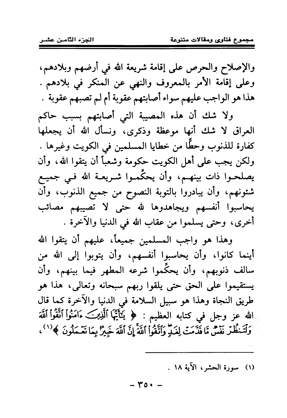 ولا شك أن هذه المصيبة التي أصابتهم بسبب حاكم العراق لا شك أنها موعظة وذكرى، ونسأل الله أن يجعلها كفارة للذنوب وحالا من خطايا المسلمين في الكويت وغيرها. ولكن يجب على أهل الكويت حكومة وشعبا أن يتقوا الله، وأن يصلحوا ذات بينهم، وأن يحكموا شريعة الله في جميع شئونهم، وأن يبادروا بالتوبة النصوح من جميع الذنوب، وأن يحاسبوا أنفسهم ويجاهدوها لله حتى لا تصيبهم مصائب أخرى، وحتى يسلموا من عقاب الله في الدنيا والآخرة.