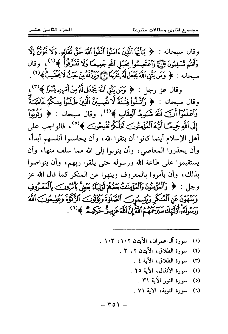 وقال سبحانه: {يَا أَيُّهَا الَّذِينَ آمَنُوا اتَّقُوا اللَّهَ حَقَّ تُقَاتِهِ وَلَا تَمُوتُنَّ إِلَّا وَأَنْتُمْ مُسْلِمُونَ} (¬1) {وَاعْتَصِمُوا بِحَبْلِ اللَّهِ جَمِيعًا وَلَا تَفَرَّقُوا} (¬2) وقال سبحانه: {وَمَنْ يَتَّقِ اللَّهَ يَجْعَلْ لَهُ مَخْرَجًا} (¬3) {وَيَرْزُقْهُ مِنْ حَيْثُ لَا يَحْتَسِبُ} (¬4) .