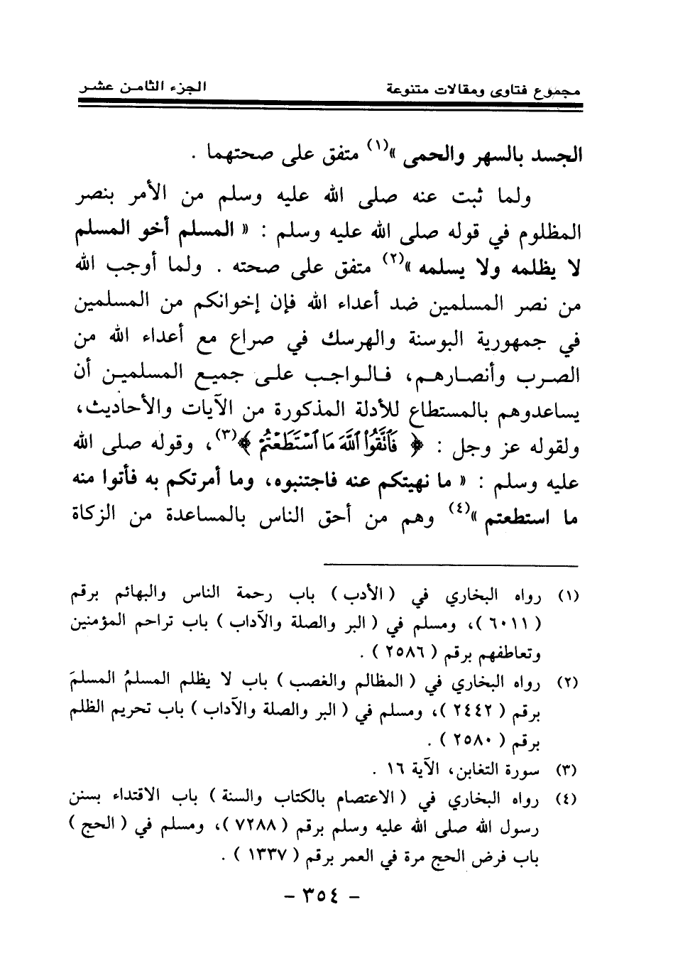 ولما أوجب الله من نصر المسلمين ضد أعداء الله فإن إخوانكم من المسلمين في جمهورية البوسنة والهرسك في صراع مع أعداء الله من الصرب وأنصارهم، فالواجب على جميع المسلمين أن يساعدوهم بالمستطاع للأدلة المذكورة من الآيات والأحاديث، ولقوله عز وجل: {فَاتَّقُوا اللَّهَ مَا اسْتَطَعْتُمْ} (¬3) وقوله صلى الله عليه وسلم: «ما نهيتكم عنه فاجتنبوه، وما أمرتكم به فأتوا منه ما استطعتم (¬4) » وهم من أحق الناس بالمساعدة من الزكاة